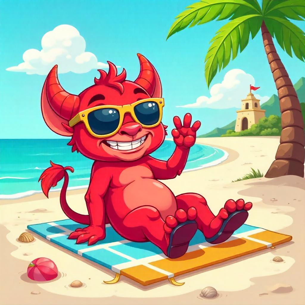 An adorable, friendly cartoon demon with red skin, tiny curved horns, a short curling tail with a small flame at the tip, big round eyes, and a goofy grin. The demon lounges on a bright beach towel on white sand, wearing colorful sunglasses and flip-flops. The scene shows turquoise ocean waves, a clear blue sky, palm trees, seashells, and a sandcastle. A playful beach ball bounces in the background. The art style is bold, chunky outlined 2D cartoon with flat, saturated colors and light cel shading for a retro-vector look. Cheerful, sunny mood.