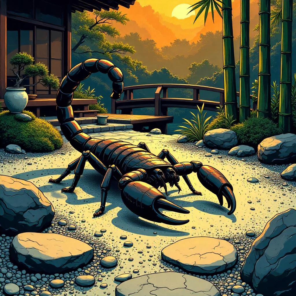A bold, high-contrast comic-book style illustration of a scorpion creeping through a tranquil zen garden. Thick black ink outlines, vibrant flat colors, and halftone shading give a retro superhero vibe. The scorpion is sleek with an armored exoskeleton, oversized pincers, and a dramatic arched tail. Surrounding it, raked gravel forms precise geometric patterns, with smooth stepping stones, a mossy boulder, a small bonsai in a ceramic pot, and tall bamboo stalks. Warm sunlight slices through the stalks, casting long shadows. A wooden bridge and a tiny koi pond appear in the background. Dynamic action lines emphasize movement around the tail, and a bold onomatopoeia SHRIIK appears near the panel edge. Perspective is a low angle, close to the gravel, creating a heroic, cinematic feel with strong contrast.