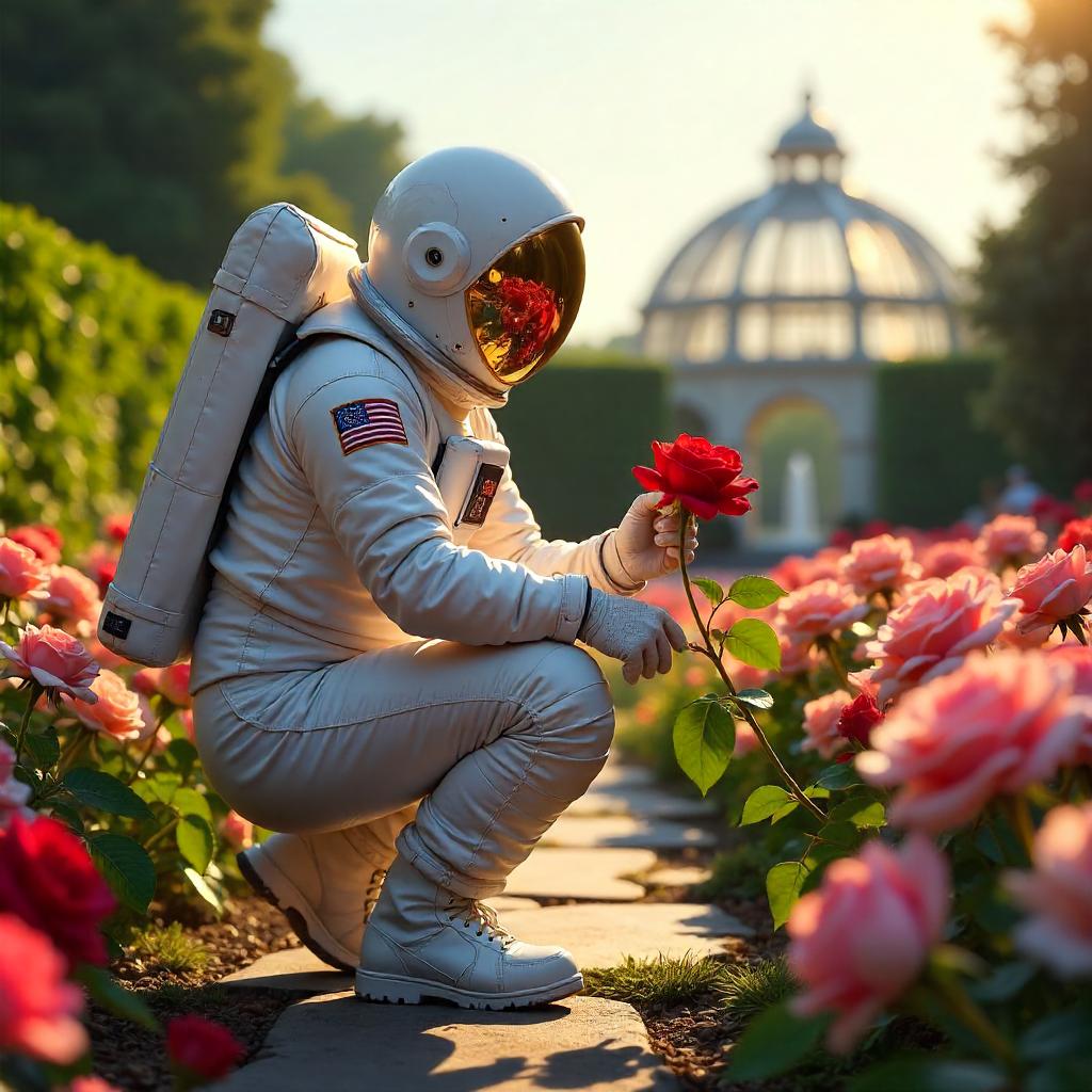 A photorealistic rendering of an astronaut in a pristine white space suit with a highly reflective, gold-tinted visor, standing kneeling to touch a velvety red rose in a lush rose garden. The scene is bathed in warm golden-hour light; petals shimmer in pinks, reds, and creamy whites; dew glistens on every petal as a light breeze rustles leaves. The suit bears visible patches, including a subtle NASA-like insignia on the shoulder and a mission patch on the arm, with small scuffs on the boots and faint dirt from travel. Surroundings feature manicured rose beds, a winding stone path, and trailing ivy, with a distant glass-dome greenhouse hinting at a futuristic conservatory under a clear blue sky. The camera angle is at eye level, with a shallow depth of field so foreground roses softly blur and the background remains crisp enough to reveal hedges and a fountain. Ultra-detailed, 8k realism, 85mm lens, RAW look, natural colors, high dynamic range, soft lens flare from the sun.