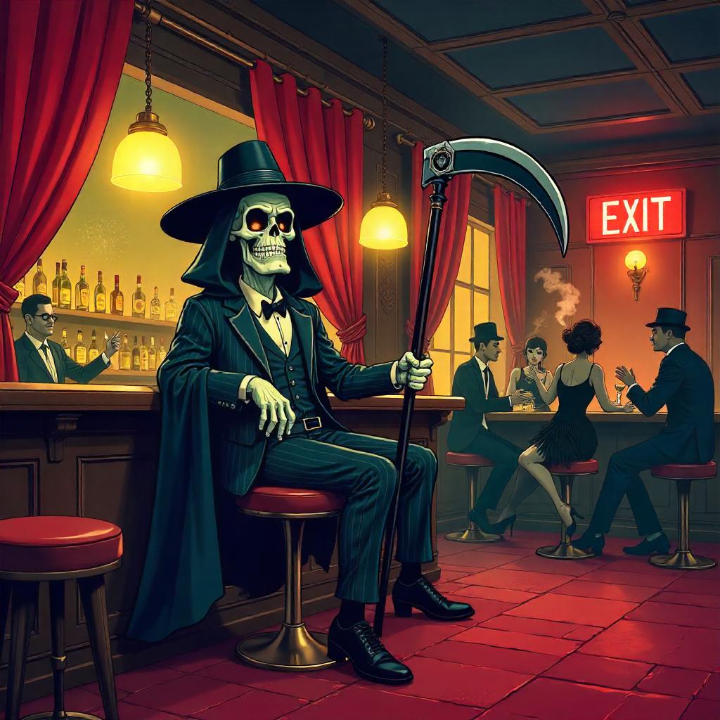 A cartoon-style reaper character in a sultry 1920s speakeasy. The reaper wears a pinstripe suit, a small cape, and a friendly grin, with a oversized scythe that doubles as a cane. He lounges on a bar stool, surrounded by amber glow from brass lamps, velvet curtains, wood paneling, and Art Deco decor. A jazzy band plays on a small stage; flapper dancers whirl in fringe; patrons in fedoras and cloche hats sip cocktails at tables. Smoky haze drifts through the air, neon EXIT sign and glowing signs, cigarette smoke rings, and moody film-noir lighting. Bold outlines, bright cartoon colors, dynamic composition, humorous yet classy vibe.