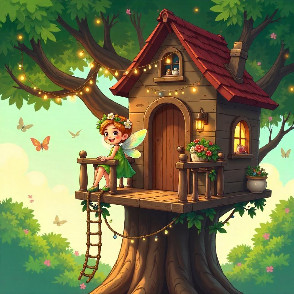 Pixie in a Cozy Tree House: Whimsical Cartoon