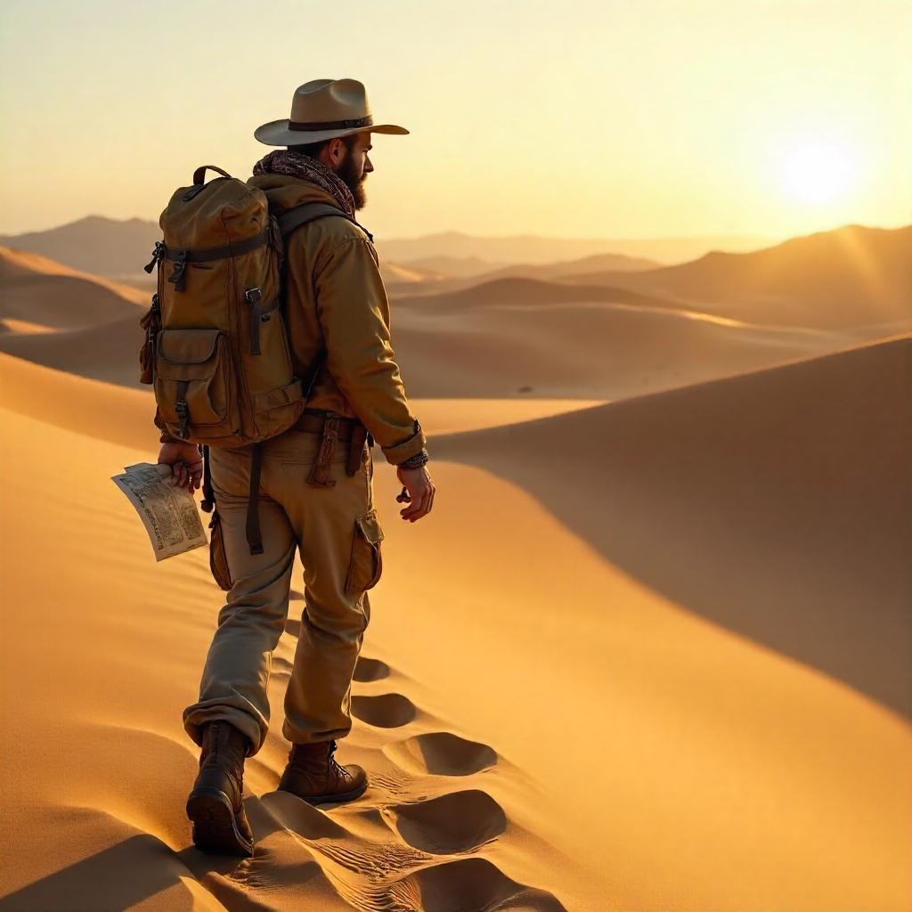 Photorealistic scene of a lone explorer navigating a vast desert of wind-sculpted sand dunes at golden hour. The explorer wears a wide-brimmed hat, a scarf wrapped over the face, a rugged tan jacket, cargo pants, and a weathered backpack. In one hand he holds a compass and a fluttering map. The sun is low, casting long shadows and bathing the dunes in warm amber light. Close-up foreground shows intricate sand textures and footprints, while distant ridges fade into a soft heat haze. High-detail, ultra-realistic lighting, 8k quality, cinematic composition with shallow depth of field focusing on the explorer.