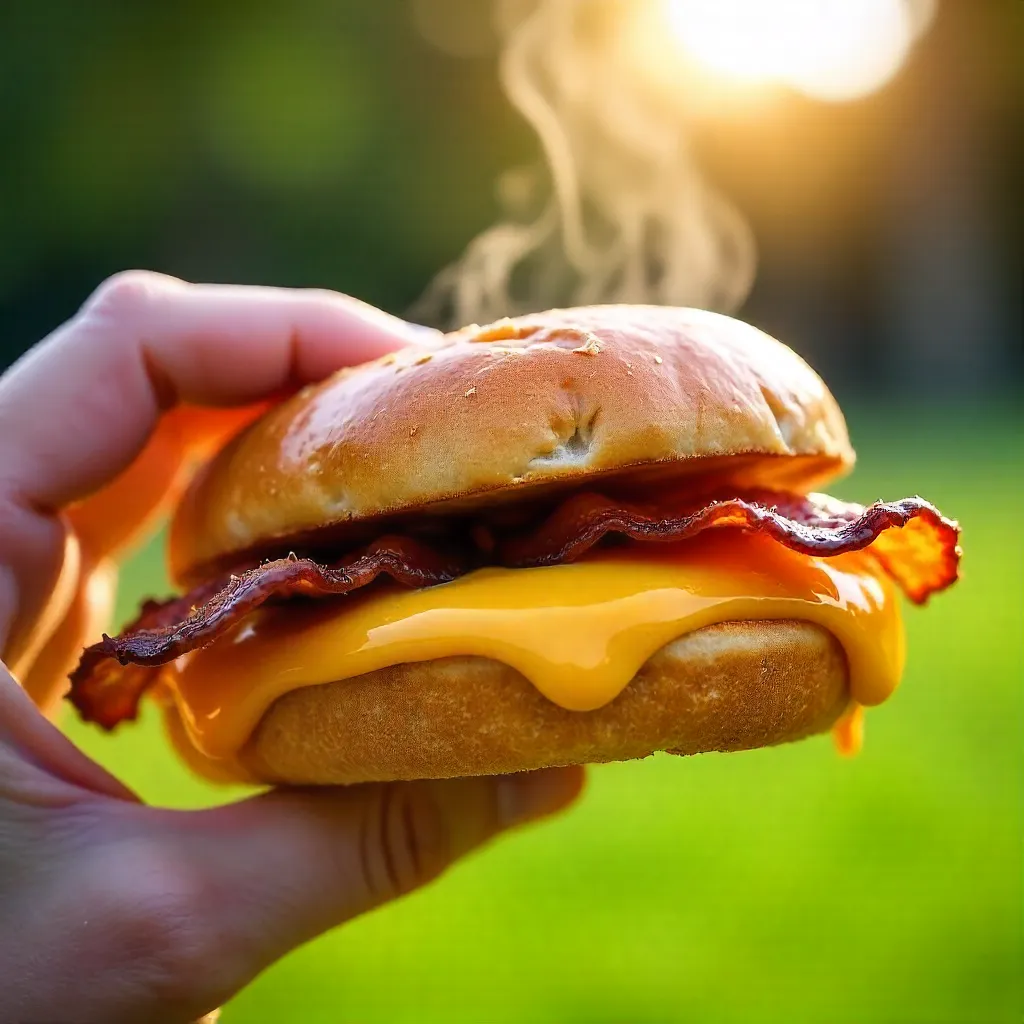 Macro close-up of a delicious breakfast sandwich outdoors in bright natural light. A toasted brioche bun cradles melted cheddar cheese and crispy bacon, with steam rising from the warm filling. The sandwich is held by a hand in the foreground, with razor-sharp detail on the gooey cheese, sizzling bacon, and golden crust, while the sunlit outdoor background (a park or garden) is softly blurred. Emphasize rich textures, glossy cheese, crispy edges, and warm, vibrant tones. Shot with a macro lens (50mm-100mm) at a wide aperture (around f/2.8) for shallow depth of field, hyper-realistic food photography.