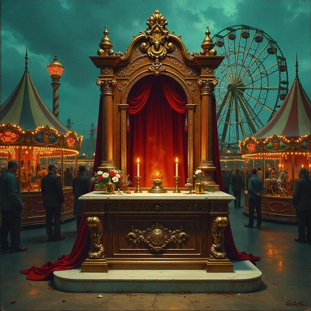 An ornate altar placed in the middle of a vintage amusement park at dusk, rendered as an oil painting with thick impasto brushstrokes. The altar sits on a marble dais, carved wood with gold leaf, adorned with cherub motifs and flowing crimson velvet drapery. Candles burn along the altar, their warm amber light reflecting on brass filigree and offering flowers, coins, and small tokens. Surrounding the altar are carnival elements: a towering Ferris wheel in the background, a gilded carousel, striped tents, and flickering neon signs. The scene has a surreal, dreamlike atmosphere, blending sacred and secular imagery with Baroque chiaroscuro. Rich, earthy color palette of golds, mahogany, emerald greens, and midnight blues, with visible brushstrokes and thick texture that emphasizes the oil painting look. The mood is eerie yet wondrous, as if a quiet prayer echoes through a carnival after sunset.