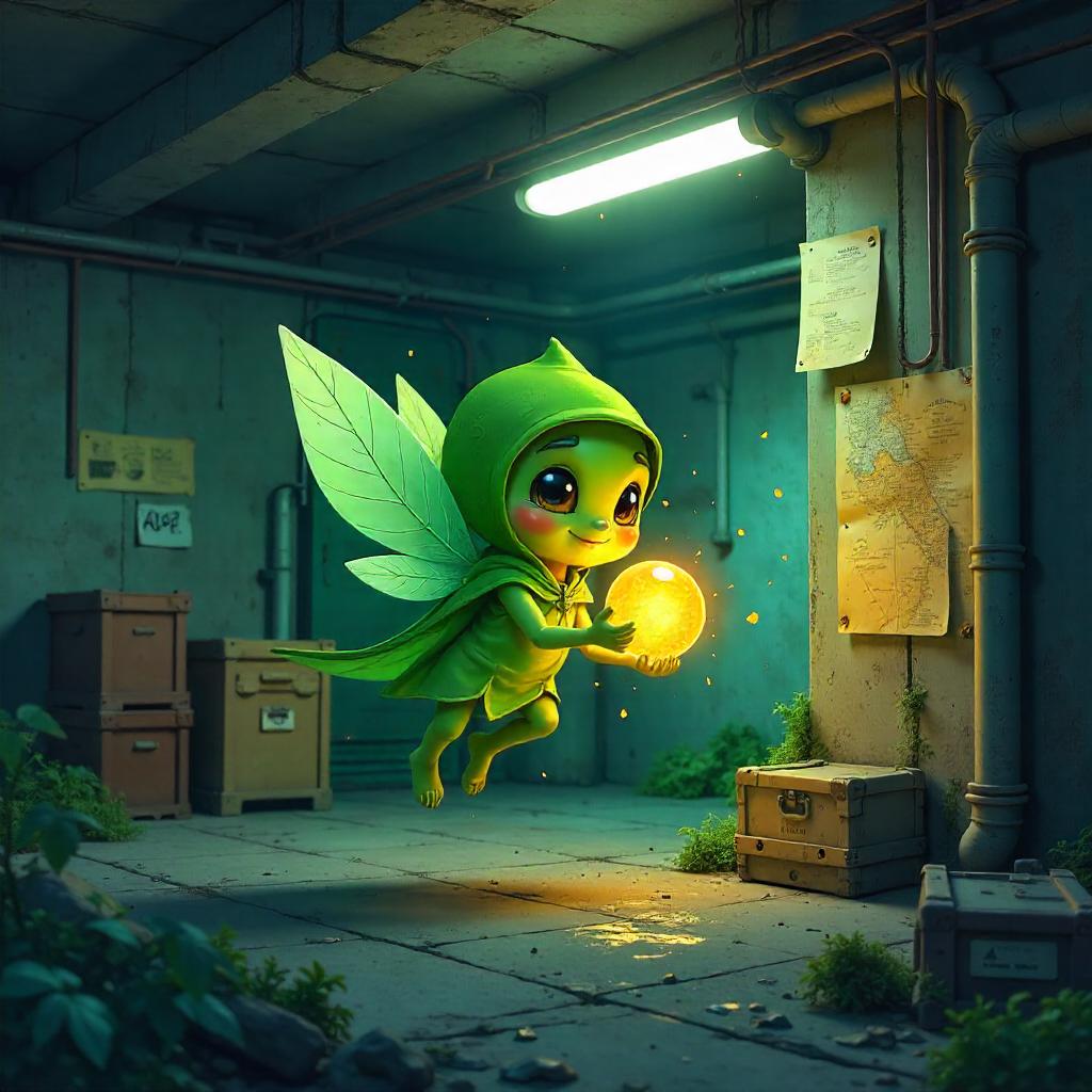 A tiny cartoon-style sprite, a whimsical magical creature with translucent, glimmering wings and a leaf-green cloak, hovering inside a dim concrete underground bunker. The bunker is lit by flickering fluorescent lights, with exposed pipes, rusted metal, crates, and maps taped to the walls. The sprite holds a softly glowing orb that casts warm amber light, illuminating wide, curious eyes. Use a bold, cel-shaded 2D illustration style with bright, playful colors—greens, blues, and the orb’s glow contrasting against cool gray concrete. Include atmospheric details like dust motes in the air, subtle graffiti, and moss creeping along the floor and walls. Perspective slightly from below to emphasize the sprite’s size and whimsy, giving a hopeful, adventurous mood in a dangerous setting.