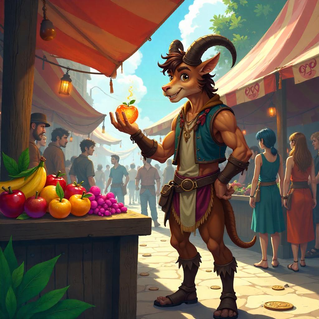 Anime Satyr Vendor in a Bustling Fantasy Market