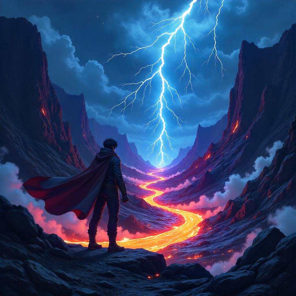 An epic anime-style scene at night: a fearless warrior stands near a glowing lava flow in a jagged volcanic canyon. Thunderous lightning bolts crack the stormy sky, illuminating sharp rock formations and steam rising from the molten river. The lava casts molten orange and red reflections on the character, whose wind-swept cape and hair whip with the gusts. The character wears a dark jacket, combat boots, and gloves; they crackle with electric energy around their fists or a held weapon, with blue-white arcs weaving through the air. Compose it in a dynamic three-quarter view from a low angle to emphasize power, with bold cel-shaded lines, saturated colors, and high-contrast lighting. Include neon blue and purple lightning, orange lava glow, and atmospheric ash particles. Style: anime, highly detailed, cinematic, with motion blur on the cape and steam wisps, giving a sense of imminent eruption.