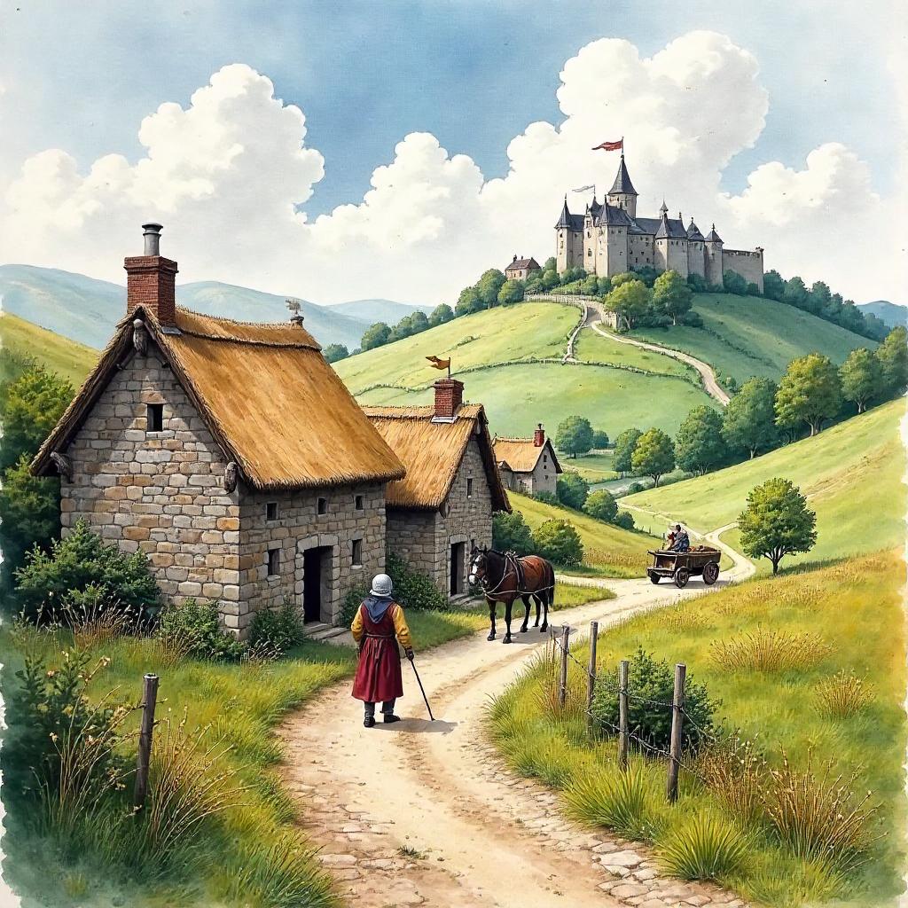 Wind-Woven Medieval Village in Watercolor