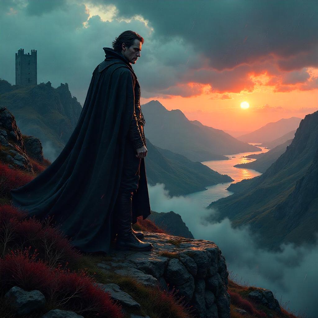 Concept art of a centuries-old vampire standing on a windswept Scottish highland cliff. Backlit by a stormy sunset, his cape billows, pale skin glows against the dark moor, and piercing red eyes with faint fangs. The rugged landscape features heather on jagged rocks, mist-filled valleys, a distant ruined fortress, and a glinting loch. Cinematic lighting with cool blues and purples contrasted by warm horizon glow; rain-slick textures on leather and stone; wind-riven hair. Digital-painting style with high detail, painterly brushwork, and a restrained, aristocratic menace suitable for concept art.
