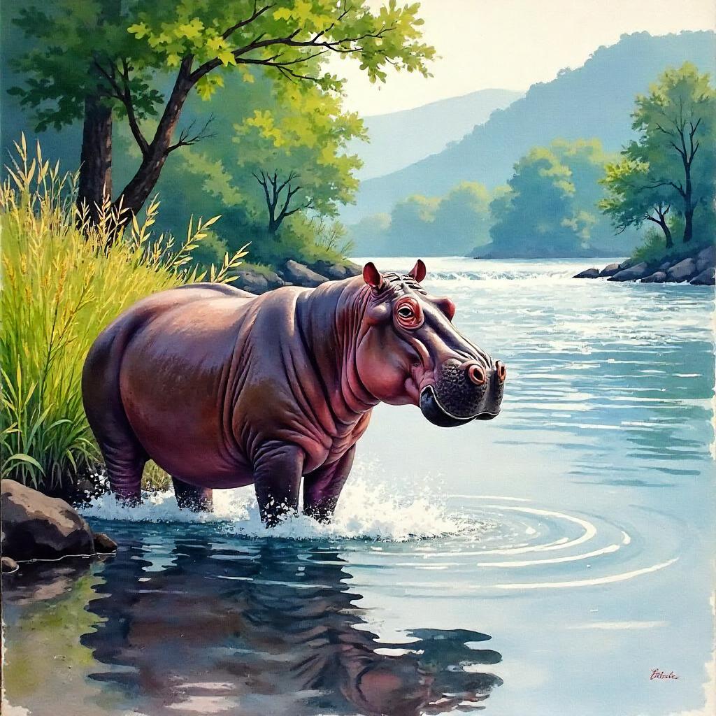 Watercolor Hippo by a Rushing River