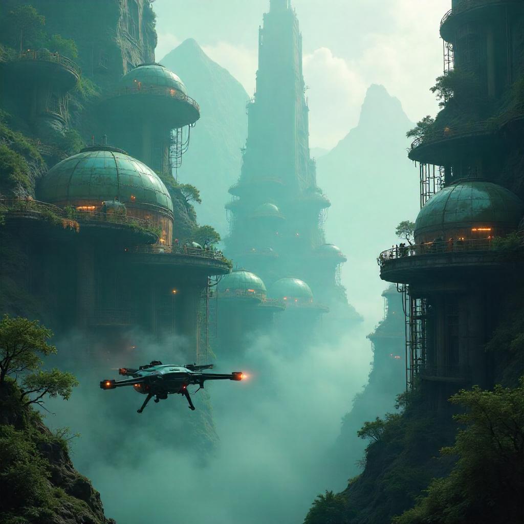 Ultra-detailed concept art scene of a terraforming station enveloped in thick mist. A sprawling network of modular habitats, greenhouse domes, and vertical farms interconnected by catwalks and cranes. Fog rolls through pipes and scaffolding; soft cyan and emerald lighting bleeds through glass and weathered metal. In the foreground a maintenance drone glides through the haze, its searchlight cutting rays of volumetric light. The background reveals towering domes and terraforming engines dimly lit, with distant alien mountains faintly visible. Mood is moody, awe-inspiring, and cinematic, with painterly textures and tactile details. Style: science-fiction concept art, high detail, cinematic lighting, 4k resolution. Palette: cool blues, teals, with rusty copper accents; atmosphere: damp, humid, slightly radioactive glow, mist-laden air.