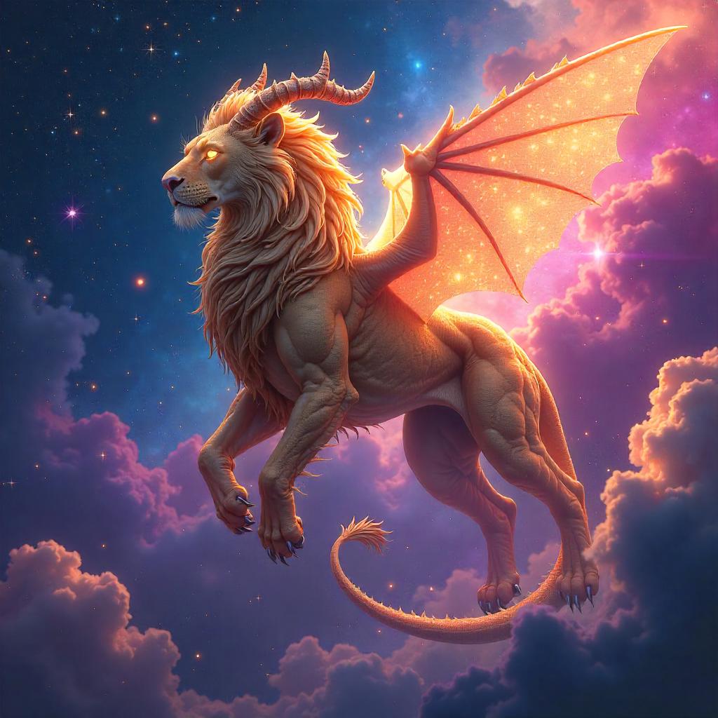 An immense chimera floats serenely through a luminous cosmic nebula. Digital painting, ultra-detailed, painterly but crisp, with cinematic lighting. The creature merges a lion's head and mane with dragon horns, a goat-like back crest, and a sinuous serpentine tail. Its torso is cloaked in golden fur that transitions to iridescent dragon scales along the spine; translucent, neon-wing membranes stretch from its shoulders, glowing with star-light. The chimera's eyes burn with nebula-blue fire. Surrounding it, swirling gas clouds in magenta, pink, purple, and electric blue, dotted with glittering stars and wisps of cosmic dust; distant galaxies ripple in the background. The scene uses luminous gradients, rim lighting, and subtle glow reflections on fur, scales, and wings. Pose: three-quarter view, mid-air, with trailing stardust and energy arcs to convey motion. Overall mood: ethereal, majestic, and otherworldly.