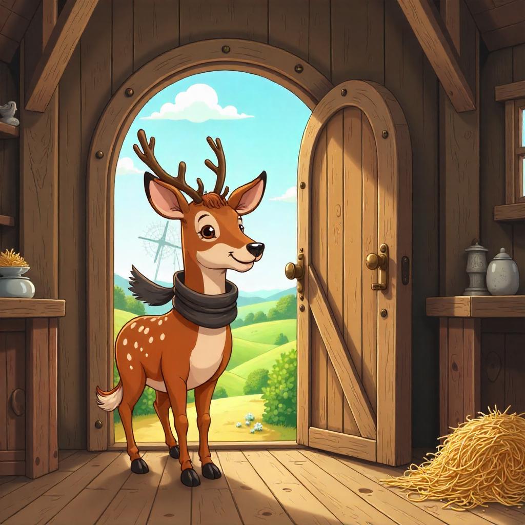 A cute cartoon deer wearing a tiny scarf peeks out from the doorway of a cozy windmill interior. The room is wooden with beams, gears, and straw on the floor. Bold cartoon style with thick black outlines, soft shading, and vibrant pastel colors. Outside, a sunny blue sky with fluffy clouds and green fields; windmill blades visible through a circular window. The scene is whimsical and child-friendly.