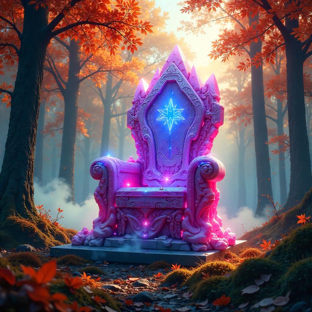 An ultra-detailed cyberpunk fantasy scene featuring a crystal throne carved from translucent sapphire and pink crystal sitting in a sunlit autumn forest clearing. The throne glows with neon blue and magenta circuitry along the armrests and back, with holographic runes hovering above it. Surrounding trees display autumn leaves in orange, amber, and red; golden rays pierce through the canopy, casting warm light while a cool neon glow from the throne creates a surreal contrast. Mist and fog swirl at ground level, sparkling with dew. The forest floor is a mix of moss, fallen leaves, and faint metallic panels. Subtle cyberpunk elements include chrome accents on the throne, microcircuit textures etched into the armrests, small drones perched on branches, and a faint holographic HUD floating near the throne. The composition is a wide cinematic view from a low angle, emphasizing the throne's regal, dystopian majesty. Render in a hyper-detailed digital painting style with rich textures: crystal facets catching light, bark textures, and luminous glow; palette of warm autumn tones balanced with electric blues and purples; high dynamic range, crisp shadows, and filmic lighting; aspect ratio 16:9.