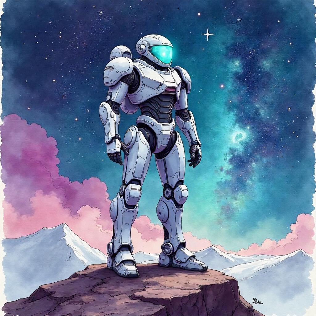 Watercolor illustration of a futuristic mech suit standing on a rocky outcrop, drifting among a star-filled expanse. The armor features pale blue-gray panels with soft purple shadows, rendered with loose wet-on-wet watercolor washes that bleed at the edges. In the background, distant nebulae glow in pinks, purples, and greens, with a faint spiral galaxy and countless twinkling stars. Light reflects off the suit's metallic surfaces; the cockpit visor emits a gentle cyan glow. The scene conveys quiet exploration and weightlessness, with impressionistic brushstrokes and a dreamy, ethereal atmosphere.