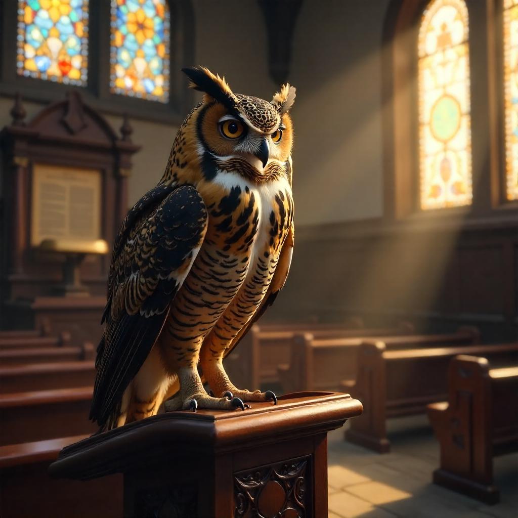 A photorealistic scene of a majestic owl perched on a carved wooden lectern inside a quiet synagogue. The ark with Torah scrolls glows softly in the background, while stained glass windows cast warm, colorful light across polished pews and stone floors. The owl’s textured feathers, sharp beak, and amber eyes are rendered in exacting detail as dust motes drift in the sunbeams. The composition emphasizes the bird in the foreground with reverent sacred architecture softly fading behind, using realistic lighting, shallow depth of field, and cinematic clarity.