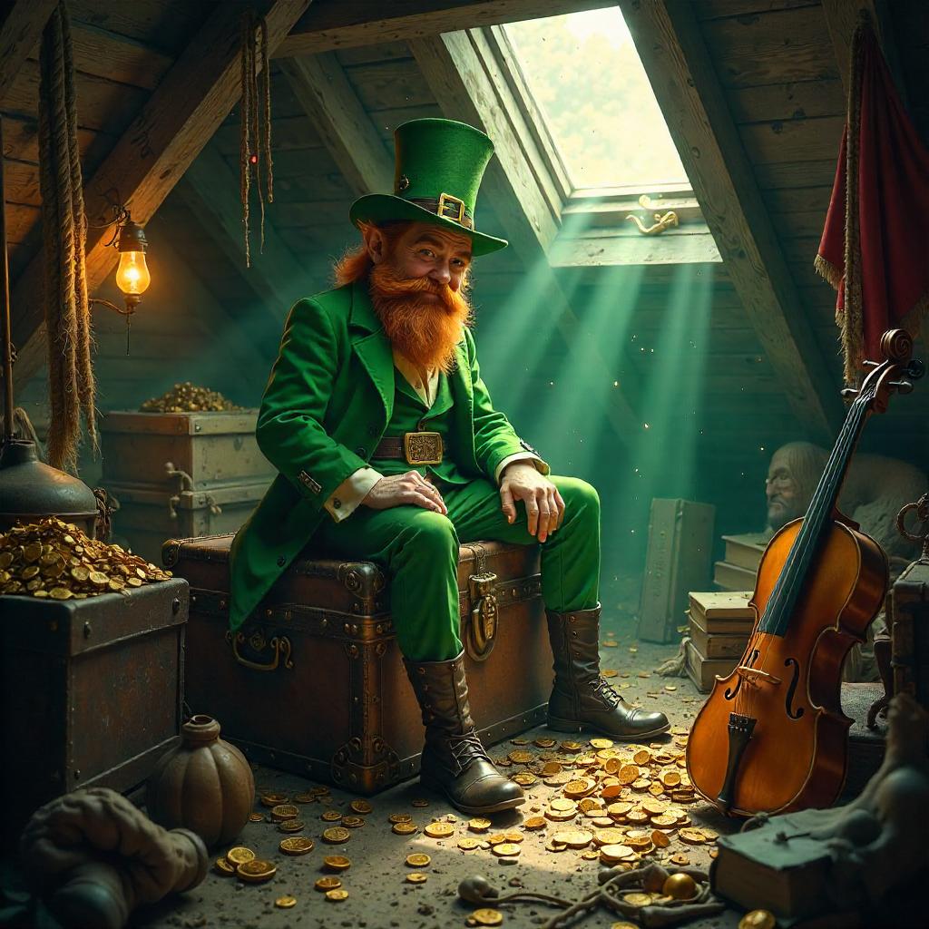 An intricate concept art scene of a mischievous leprechaun hidden among dusty attic boxes and creaking wooden beams. Warm amber lantern light mixes with silver moonbeams filtering through a small skylight, scattering dust motes. The leprechaun wears a worn green suit with a buckled belt and a tall hat, his red beard catching the glow as his sparkling eyes peek out. He sits atop an ancient trunk overflowing with gold coins and curious artifacts, surrounded by aging books, moth-eaten fabrics, and a weathered violin leaning against a crate. Cobwebs, ropes, and old portraits add atmosphere while shafts of light highlight pockets of gold and trinkets. The perspective is cinematic, slightly low-angle, with depth of field softly blurring the background to emphasize the magical aura. Painterly, highly detailed, rich greens and golds, moody and magical.