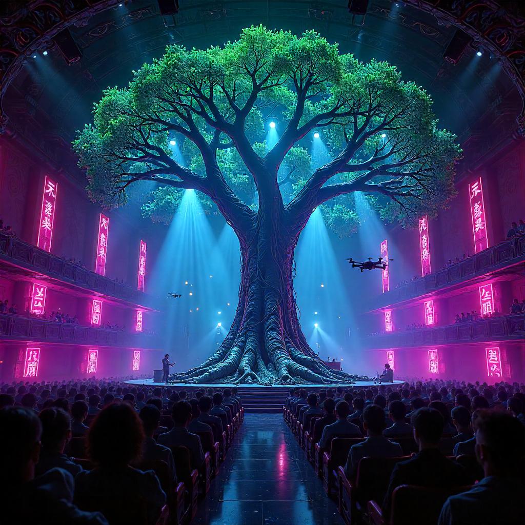 Ultra-detailed cyberpunk concert hall interior at night, a colossal bio-mechanical tree stands center stage. Its trunk and branches are chrome and living circuitry, with bioluminescent leaves glowing cyan and magenta. Vines wrapped with fiber-optic cables extend toward the audience. Drones hover like fireflies around the tree, and holographic glyphs float along art-deco columns. The velvet seats, glassy floor, and rain-slick reflections enhance the neon glow. Stage lights pulse with synthwave rhythms, neon signage in kanji flickers, and AR glass-wearers in the crowd watch in awe. The tree’s roots weave into the microphone stand and sound systems, visualizing music as ripples of light. Wide-angle, cinematic, hyperreal, 8k realism with volumetric lighting and moody ambiance.