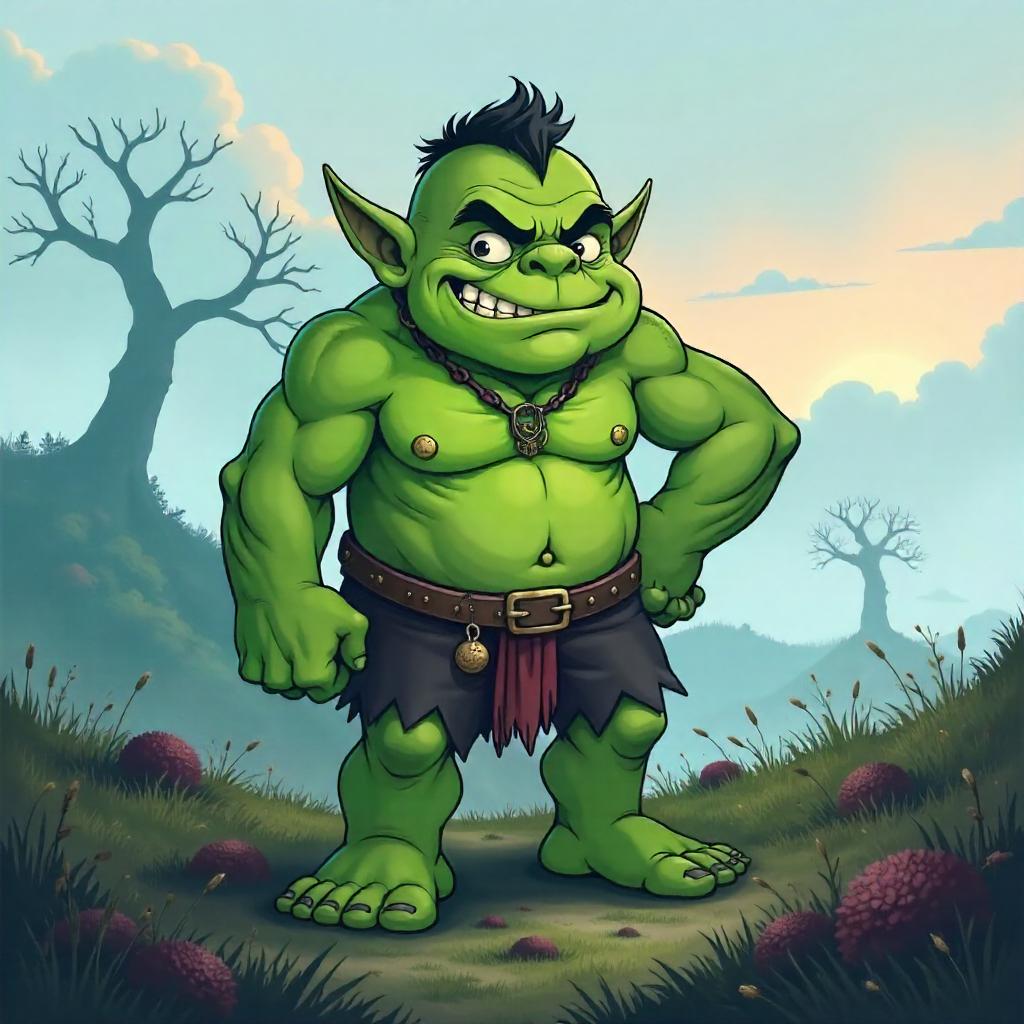 Cartoon-style orc: a friendly green-skinned orc with a large head and chunky limbs, bold black outlines and flat bright colors. He stands on a fog-covered moor as mist swirls around tufts of heather and tall grasses, with distant silhouettes of gnarly trees. A pale dawn sky in soft blues and purples washes the scene. Three-quarter view, the orc has a curious cheerful expression, one hand on hip. The mood is whimsical but a touch mysterious, with light fog textures and light cel-shading to emphasize the cartoon look.