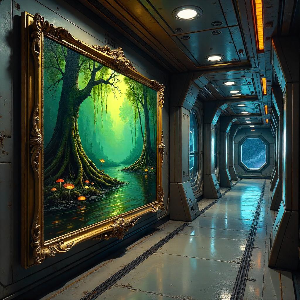 An oil painting on canvas hung inside a futuristic spaceship corridor. Thick impasto brushstrokes render a swamp scene: tangled mangrove roots, murky green-brown water, hanging Spanish moss, and bioluminescent fungi along the banks shimming in an eerie glow. The palette is deep greens, earthy browns, ochres, and smoky greys. Warm amber ship-lamp light highlights the canvas while cool blue-white console lights spill onto chrome walls nearby. A large viewport at the far end reveals a starry void and a distant nebula, blending pastoral swamp with sci-fi. The painting sits in an ornate brass-and-weathered wood frame, contrasting with sleek metallic surroundings. The mood is dreamlike, surreal, and cinematic, with dramatic chiaroscuro and textured brushwork typical of oil painting.