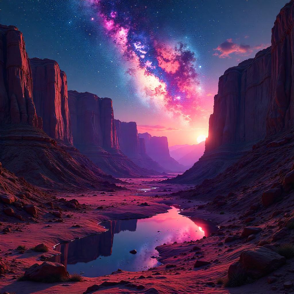 A vast canyon carved from crimson sandstone at twilight, its towering walls illuminated by a neon cosmos. Above, a colossal spiral galaxy arches across a starry sky, with bright nebulae in electric blues, magentas, and greens. The galaxy's glow washes over the canyon, creating iridescent highlights and long shadows on the rock strata. At the canyon floor a shallow, glassy pool mirrors the sky and the glowing rocks, while dust motes float in the air. Rendered in high-detail digital art with a cinematic wide-angle composition, ultra-clear textures, cinematic lighting, subtle lens flares, and a dreamy sci-fi fantasy vibe.