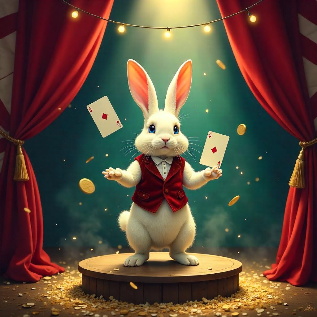 An imaginative concept art illustration of a rabbit performing inside a vintage circus tent. A white rabbit with bright sapphire eyes stands on a small wooden stage, wearing a velvet waistcoat and a tiny monocle, while levitating a few playing cards as if by magic. The tent's tall red-and-white striped curtains frame the scene, with warm string lights, velvet drapes, and a light mist swirling over sawdust. Dramatic spotlight from above casts rich shadows, giving a cinematic, painterly mood. The style blends concept art with digital painting, featuring textured fur, glossy fabrics, and surreal props like floating coins and a mechanical rabbit-ear contraption. Color palette of crimson, gold, teal, and cream, high detail, dreamlike yet whimsical vibe.