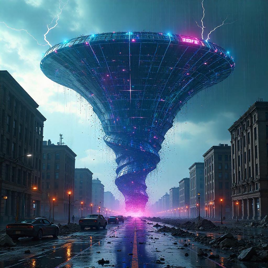 A colossal digital art sculpture rising from a shattered city street, formed from glassy neon panels and glowing circuit tracings; the piece twists into a spiraling fractal tower, its surface shimmering with electric blues, magentas, and cyan; a violent tornado roars around it, the funnel carved by wind and rain, debris swirling, lightning streaking the sky; the art seems to glitch and reassemble in real time, with pixel rain and holographic runes; cinematic lighting, high-detail 3D rendering, photoreal style, ultra-wide angle from the ground up to emphasize scale, surreal, dystopian atmosphere, awe and resilience, wind-swept motion blur; the scene fuses abstract digital aesthetics with natural storm energy.
