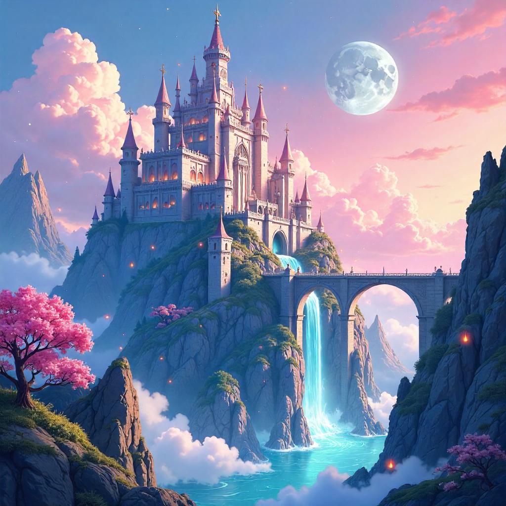 An expansive, cinematic anime-style fortress in a dream world. A towering, multi-tiered stone fortress sits atop a crystal cliff, with spired turrets, ornate banners, and glowing runes along the walls. A crystalline drawbridge spans a chasm to floating islands connected by arched bridges. The sky is a dreamlike gradient of pastel pinks, purples, and aquas, dotted with cotton-candy clouds, a pale crescent moon, and shimmering stars. Soft fog curls around the base, luminescent moss climbs the walls, and floating lanterns drift by. The scene is rendered in crisp anime linework with cel shading, high-contrast edges, and a magical, ethereal glow. The composition is a wide-angle landscape with lush foreground details like blooming cherry blossoms and a winding, glassy river reflecting the fortress.