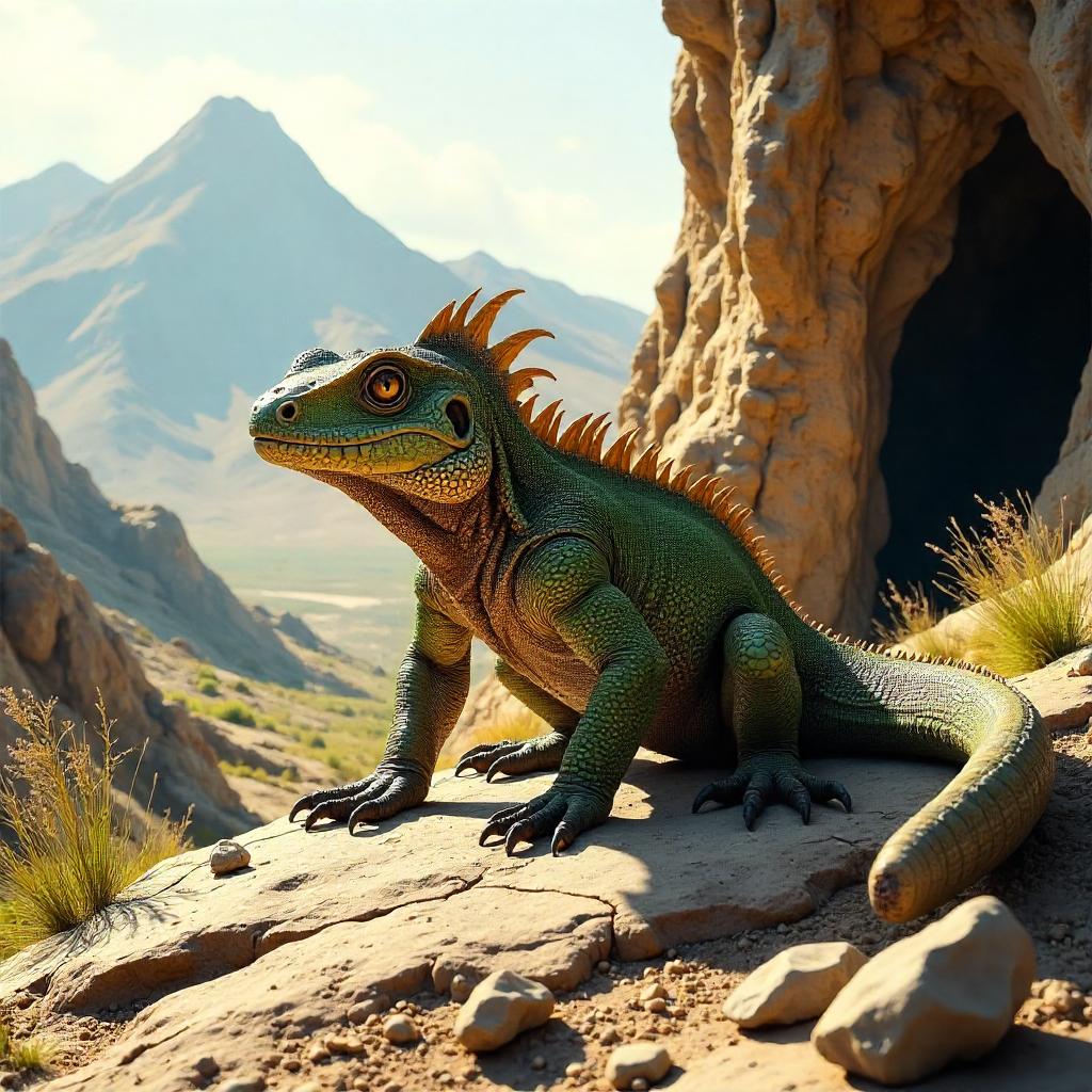 Ultra-detailed Stone Age lizard concept art: a rugged reptile with coarse, overlapping scales in mossy green, ochre, and stone-gray, a short bony crest along its head and back, amber eyes. It crouches on a cracked basalt rock in a sunlit prehistoric valley with scrub, jagged outcrops, distant volcanic hills, and a weathered cave entrance carved into the cliff. Primitive stone tools lie scattered nearby. Dusty air, warm sunset rim light, dramatic shadows, painterly textures, cinematic composition, high-detail concept art style.