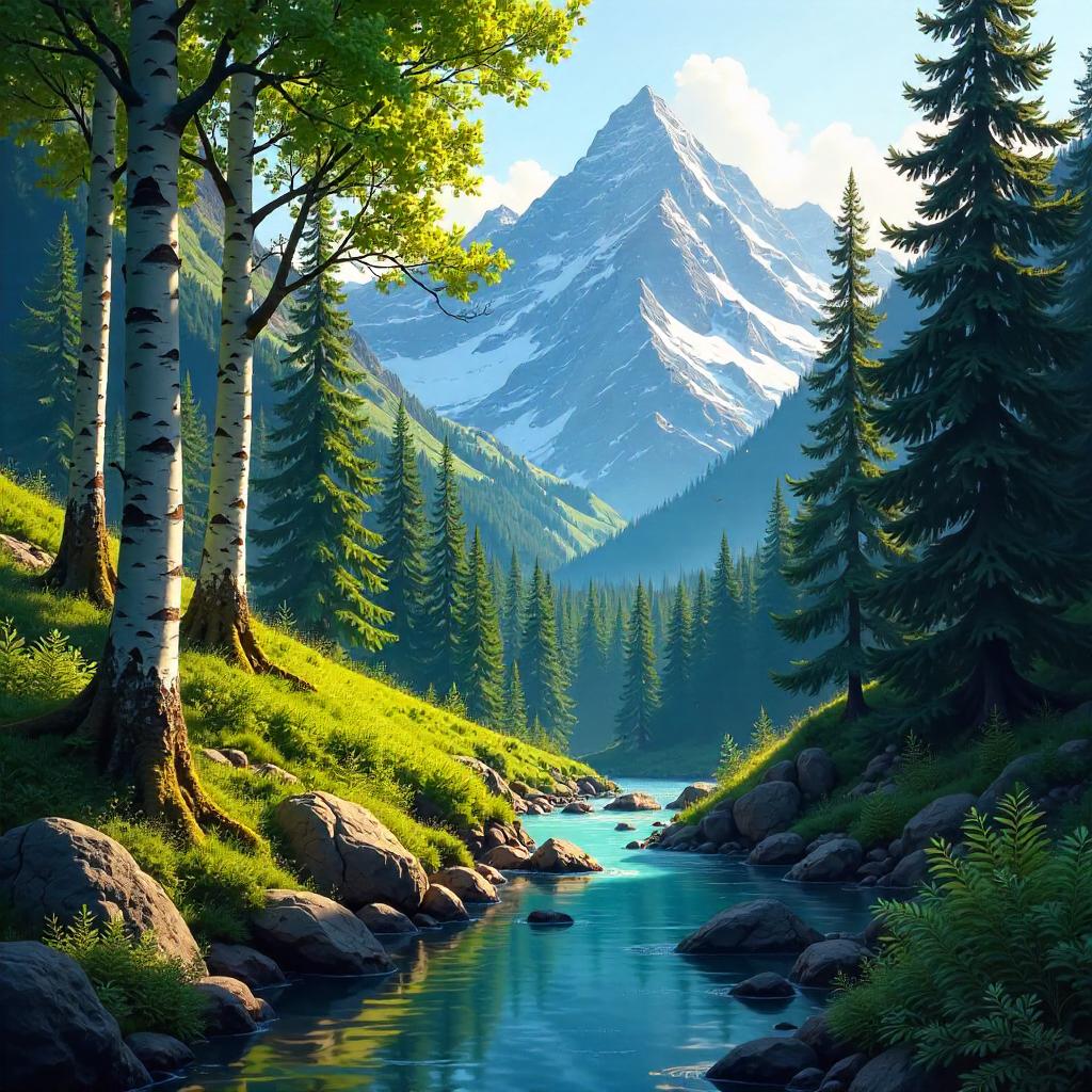 An expansive digital painting of a forest tucked in a mountain valley, viewed from a low, intimate ground-level perspective along a gently winding creek. Tall evergreens and white-barked aspens rise on both sides, mossy rocks and a carpet of ferns at the forest floor, with distant snow-capped peaks and a clear blue sky. Sunlight filters through a dense canopy, creating golden beams and shimmering reflections on the turquoise water. The color palette blends lush greens, teal water, warm amber highlights, and soft lavender shadows. Render in high-detail digital art with painterly textures, smooth gradients, and subtle glow. Add a touch of magic with faint bioluminescent motes drifting in the air. Mood: tranquil, mystical, and immersive with cinematic composition and crisp detail.