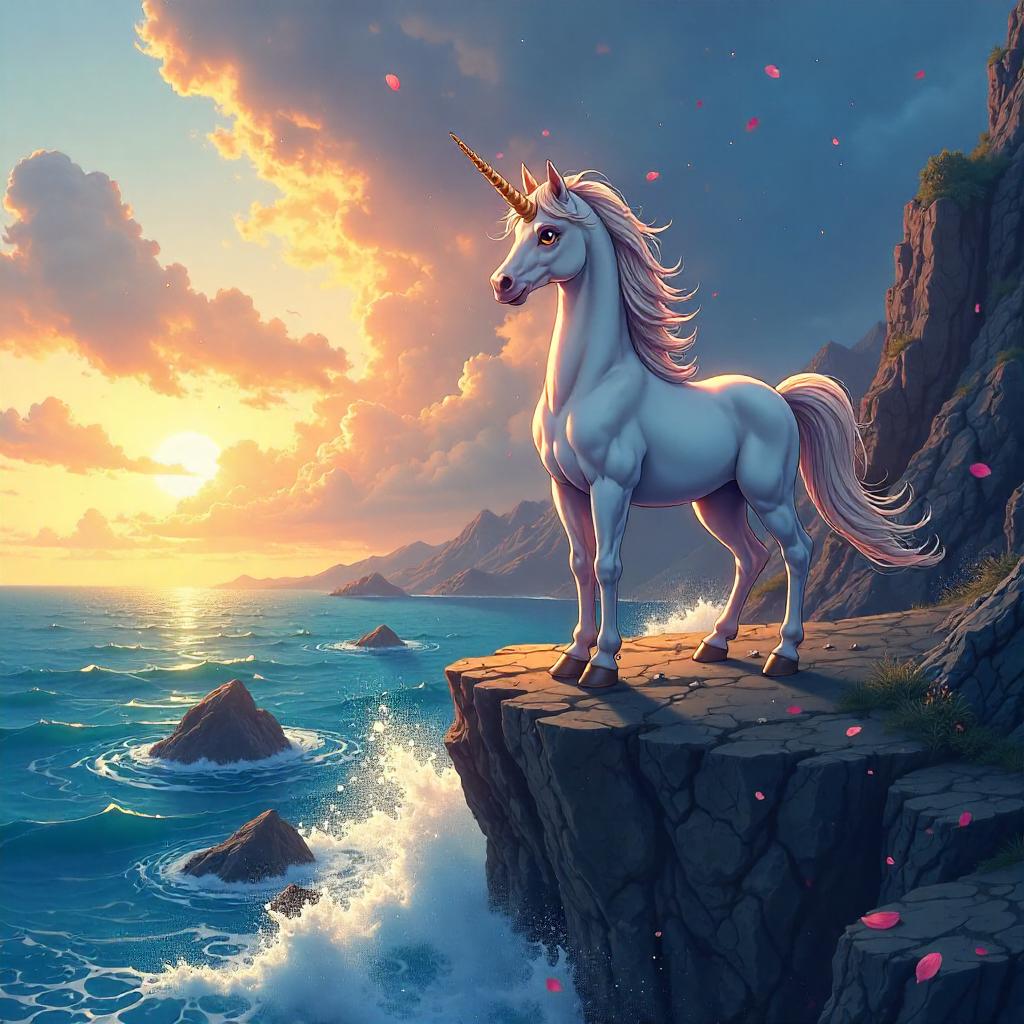 An anime-style unicorn stands on the edge of a rugged cliff, wind ruffling its mane and tail. The unicorn has a shimmering horn, large glossy anime eyes, and a gentle magical glow around its body. The scene features a dramatic golden-hour sky with warm sunlight piercing through stormy clouds, a deep blue sea crashing against jagged rocks below, and sea mist curling around the cliff face. Rich, saturated colors, crisp manga-inspired linework, soft shading, and detailed textures on rock and fur. Low-angle cinematic composition to emphasize scale, with petals or sparkles floating in the air for whimsy and a sense of magic.