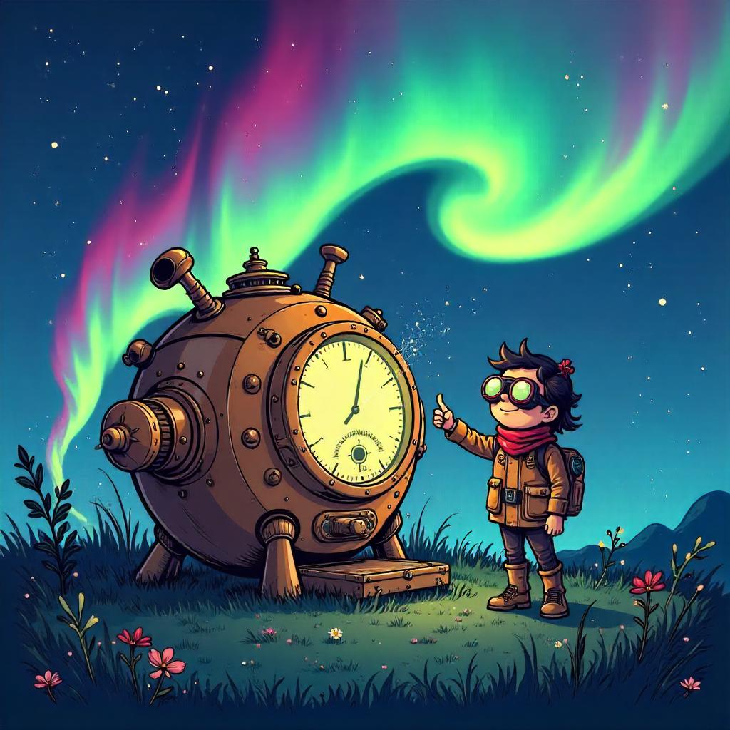 Cartoon-style illustration of a whimsical retro-futuristic time machine in a dew-kissed meadow under a spectacular aurora borealis. The machine features brass panels, rivets, a glass dome, a glowing time dial, spinning gears, multiple levers and a steam-punk vent; bold black outlines and flat, saturated colors give it a classic 1990s cartoon look. A cheerful, stylized explorer in oversized goggles and a scarf stands beside it, pointing toward the sky as sparkles and a faint time portal swirl from the machine's hatch. The night sky is deep indigo with bright ribbons of emerald, magenta, and cyan aurora sweeping across; tall grasses bend in a gentle breeze, small wildflowers scattered, stars twinkling. The composition emphasizes wonder and motion, with the time machine as the focal point, foreground grasses, and a wide horizon.