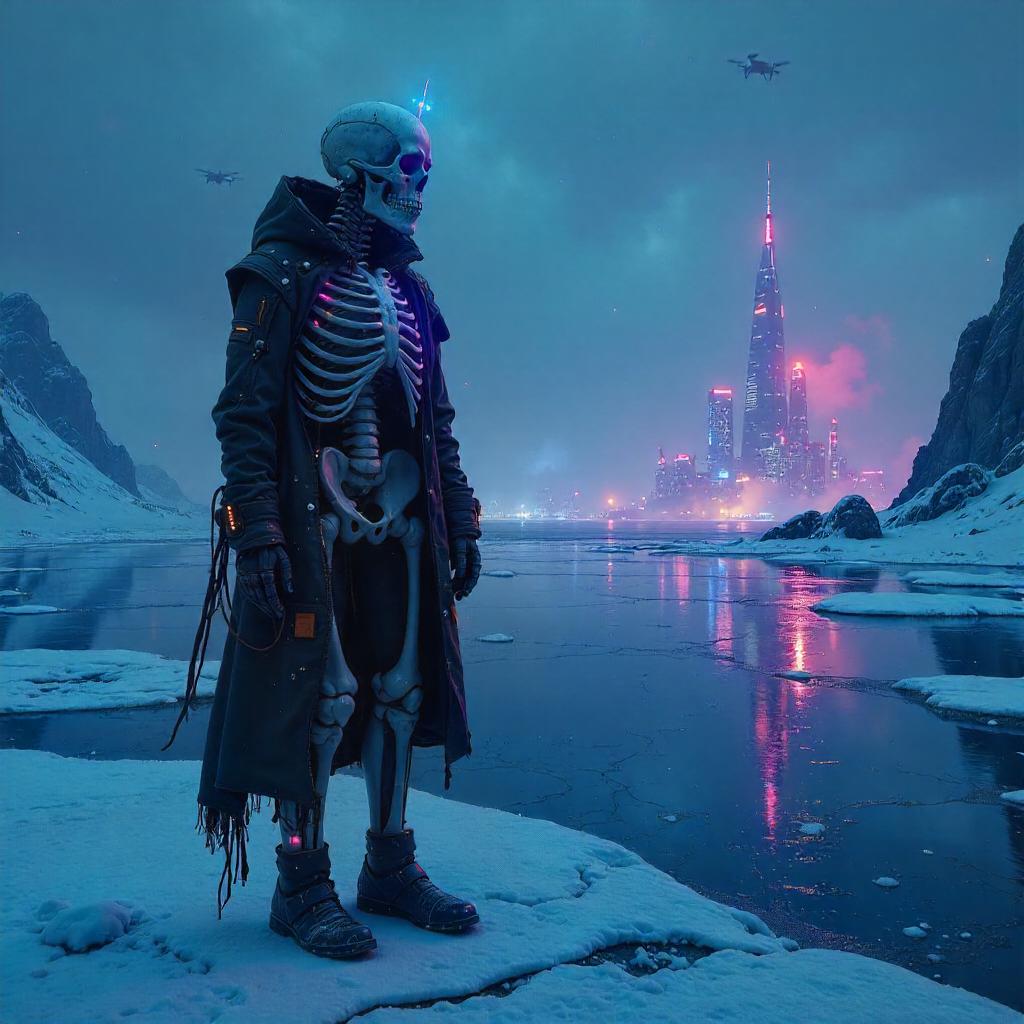 Neon Skeleton on a Frozen Lake - Cyberpunk Night