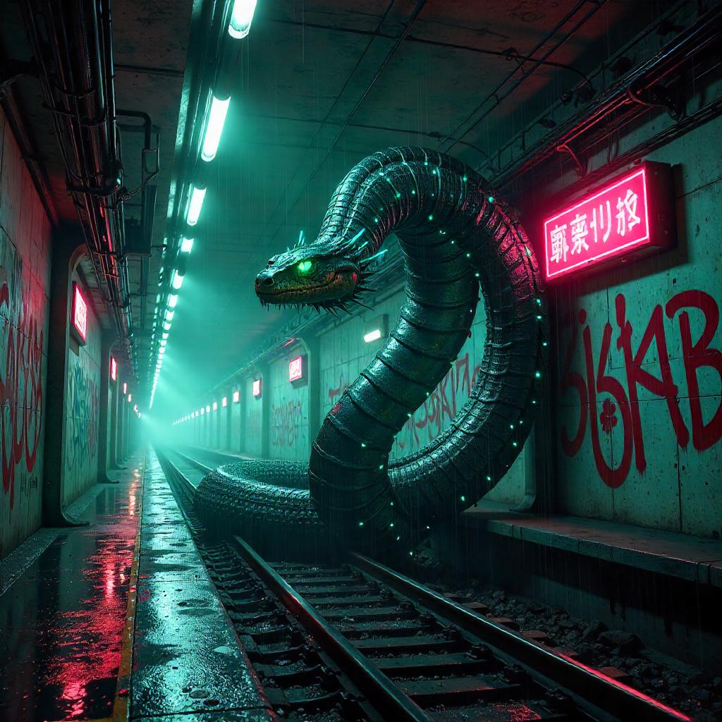 Ultra-detailed cyberpunk illustration of a colossal basilisk coiled along rain-slick subway tracks in a dim, neon-lit tunnel. The creature has chrome, scale-like plating with electric blue accents, a cybernetic crest along its spine, and glowing emerald eyes that hint at a petrifying gaze. Surroundings glow with flickering neon signs, holographic ads, graffiti on wet concrete, and overhead cables; steam vents hiss and reflect in puddles. A maintenance drone hovers nearby as a distant metro car blurs past, leaving motion trails. Cinematic lighting, volumetric fog, and hyperreal textures convey danger and awe in a 4K cyberpunk concept-art style.