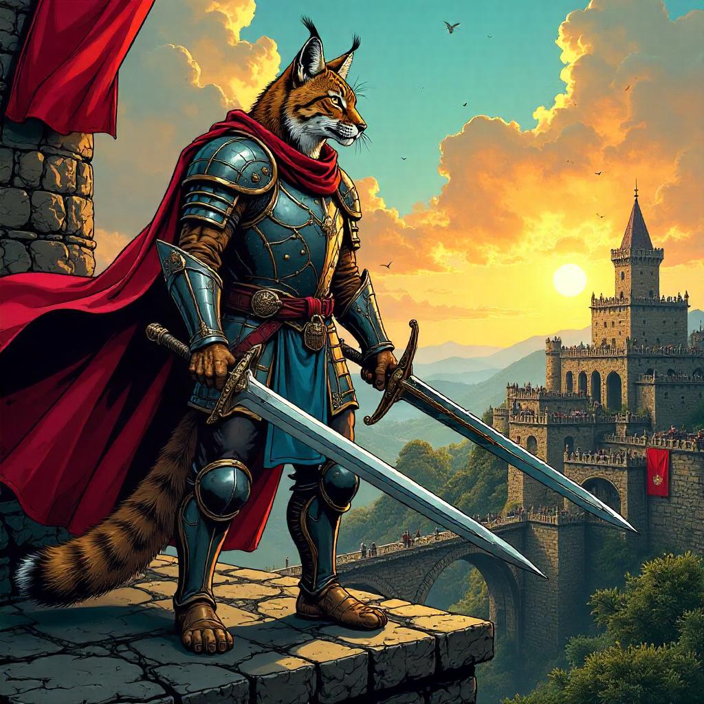 A dynamic comic-book style illustration of a lynx in medieval times. A regal lynx-warrior stands on a stone battlement, wearing ornate plate armor with a helm that leaves the ears exposed, gripping a gleaming longsword. Bold black ink outlines, high-contrast halftone shading, and vibrant colors: royal blues, burnished golds, and crimson banners fluttering in the wind. Dramatic low-angle perspective with wind whipping fur and a flowing cape. In the background, a distant medieval town with stone walls, towers, and bustling markets under a setting sun. Thick panel borders, speech bubbles, and action lines to convey splash-page energy. The overall style is cinematic, classic comic-book art.