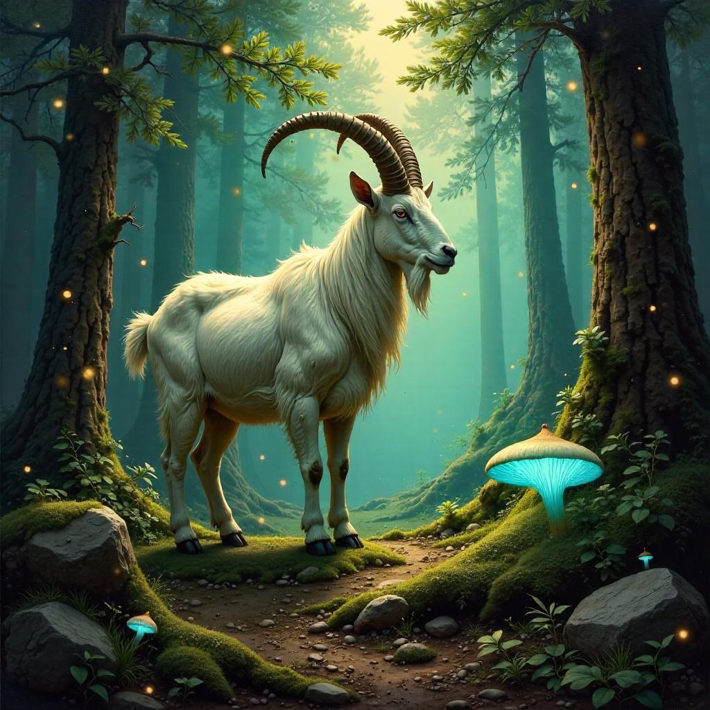 An ethereal oil painting of a majestic goat standing in a mystical forest. Thick impasto brushstrokes, dramatic chiaroscuro, sunlight filtering through ancient pines, moss-covered stones, and swirling mist. The goat bears subtly carved runes along its horns, and fur is rendered with luminous highlights. Bioluminescent fungi glow softly, casting a blue-green light. Earthy greens and browns mix with gold highlights to create a timeless, dreamlike atmosphere. Painted in the style of the old masters but infused with fantasy, with high detail on fur, bark, and light rays.