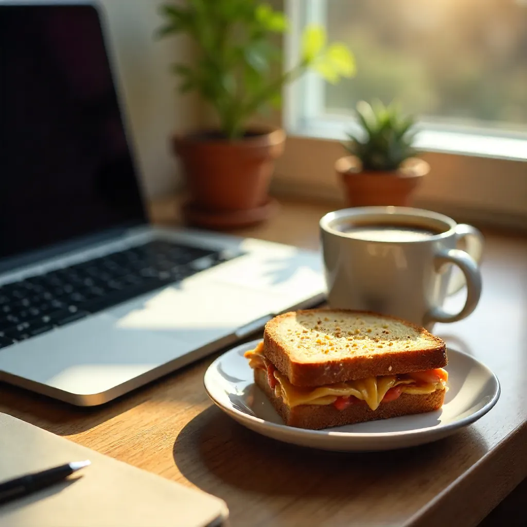 Ultra-realistic close-up of a cozy desk setup for remote work: a half sandwich on a small plate, a steaming cup of coffee beside it, and an open laptop on a warm wooden desk. Natural daylight from a nearby window casts soft, golden tones with gentle shadows. The foreground focuses on the crusty bread with sesame seeds and the glossy surface of the coffee, while the laptop and background items (notebook, pen, tiny plant) are softly blurred to convey a relaxed, productive work vibe.