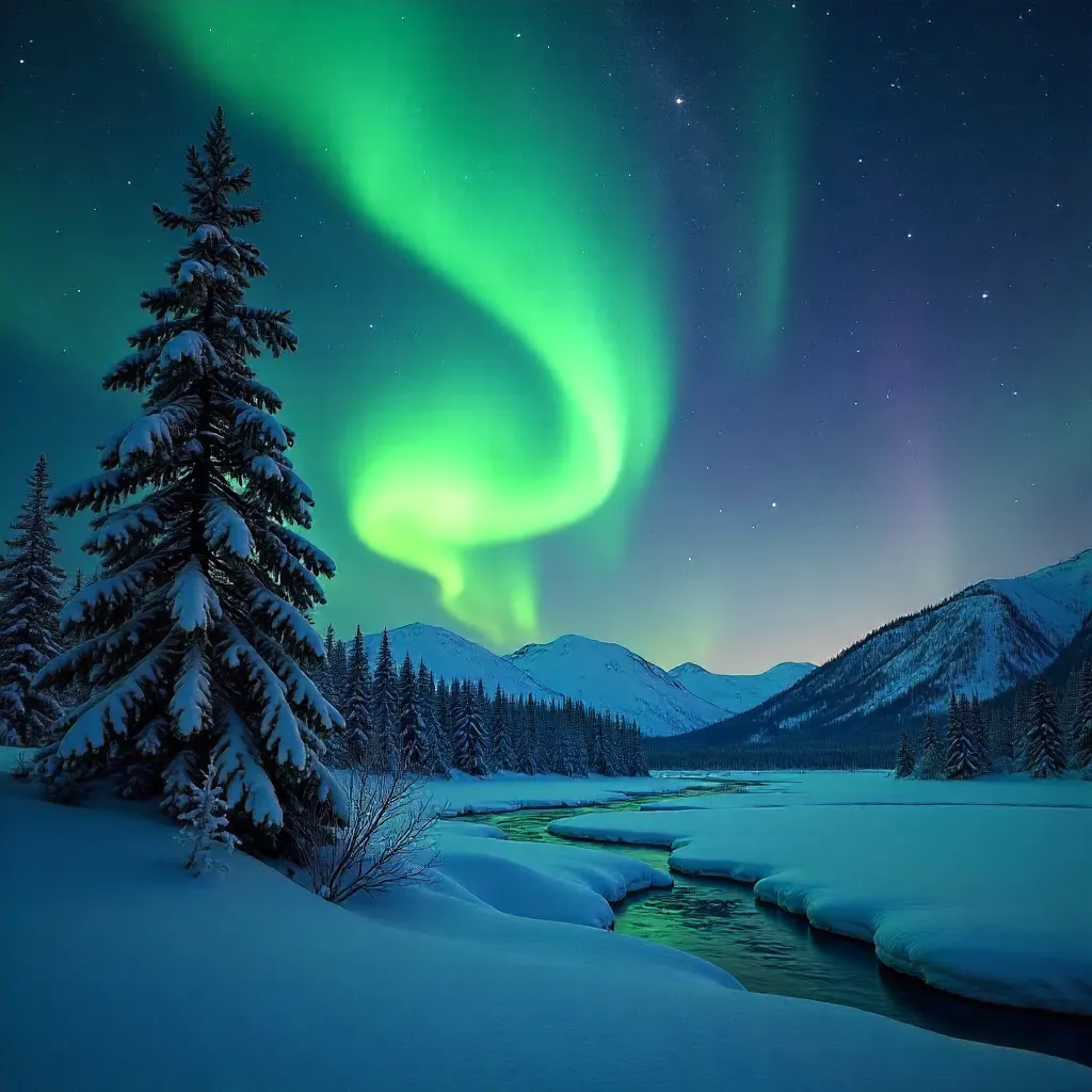 An ultra-detailed cinematic landscape of the northern lights illuminating a snow-covered evergreen forest beneath a star-filled night sky. A long-exposure scene with emerald and jade curtains of aurora dancing overhead, with hints of purple, casting a soft glow on pristine snow and frost-coated pines. The stars sparkle and a faint Milky Way band adds depth. Foreground features snow-laden trees and a quiet frozen clearing; distant hills and a reflective ice stream mirror the aurora's glow. Crisp cold air, tranquil mood, and nature's majestic beauty captured in photorealistic detail.
