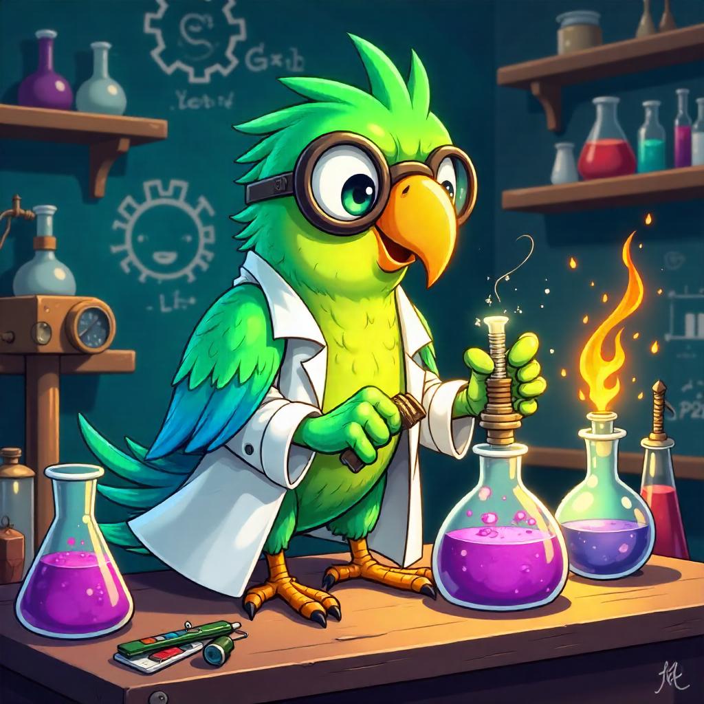 A bright, playful cartoon parrot wearing a white lab coat and round goggles stands on a cluttered mad scientist lab bench. The parrot has vivid plumage—emerald green body, blue wings, and a yellow beak—with an exaggerated, curious expression. Around it glow bubbling potions in beakers, test tubes, a fizzing purple liquid, Bunsen burners, winding cables, and a Tesla coil crackling with sparks. The walls are covered in chalk doodles of gears and formulas. The parrot tinkers with a strange device, one claw holding a test tube, the other flipping a lever. The scene uses bold cartoon outlines, bright saturated colors, and dynamic lighting to feel whimsical and energetic, in a classic 2D cartoon style.