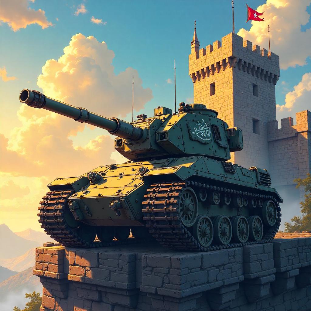 An agile anime style battle tank perched on the crenellated battlements of a grand stone castle. The tank fuses sleek mecha design with medieval motifs: angular armor plating, glowing coolant tubes, a large turret with a shimmering laser cannon, and rugged tracks with visible gears and rivets. Warm sunset light washes over stone and steel as banners flutter in the wind. The castle towers loom in the background under a dramatic sky with scattered clouds. A low angle shot emphasizes scale, with dynamic motion lines and bold cel shaded coloring typical of anime. The tank bears a crest that blends a dragon and a gear as its insignia, adding a heroic epic mood.