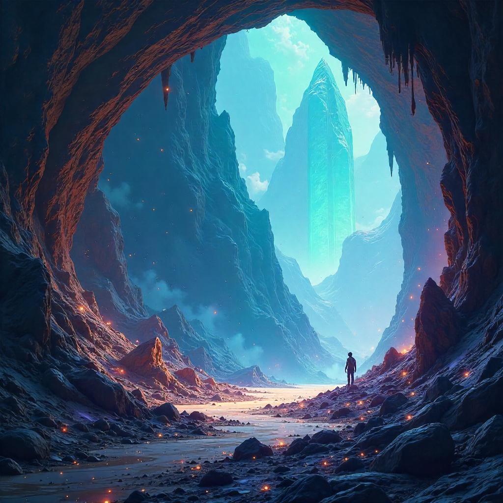 An expansive plateau carved inside a colossal crystal cavern; concept art style, wide cinematic panorama. Bioluminescent crystals glow in cyan, teal, and magenta, refracting light into prismatic facets that illuminate the plateau and jagged rock edges. Hanging crystal stalactites crown the ceiling; dust motes drift in an atmospheric glow. The ground blends smooth mineral surfaces with shard-like crystal formations catching highlights. A lone traveler stands at the edge to convey scale, dwarfed by crystalline arches and towering walls. The scene fuses real cavern geology with fantastical, otherworldly design, rendered with painterly, high-detail textures suitable for matte painting. Lighting is soft yet dramatic, backlit crystals creating silhouettes and long shadows; depth enhanced by atmospheric perspective. Color palette: cool blues and purples with warm gold accents. Style cues: concept art, cinematic, sci-fi/fantasy, high detail, 3D-rendered feel with painterly brushwork.