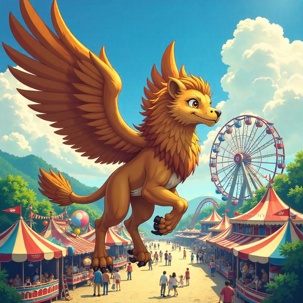 Anime Griffin Soaring Over a Colorful Amusement Park