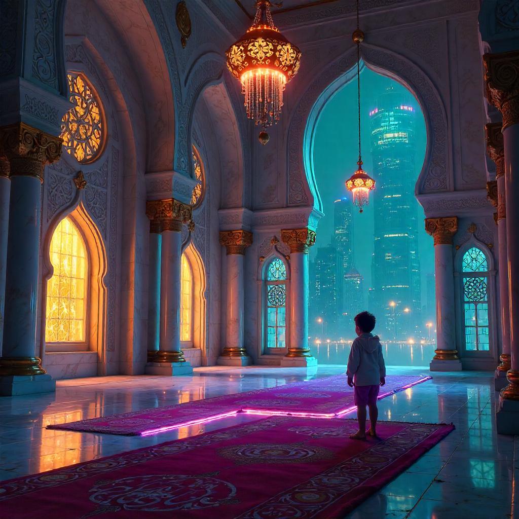 A child in a cyberpunk mosque: a grand prayer hall blending traditional Islamic architecture with neon-lit futurism. Intricate arabesque patterns carved in marble, arching colonnades, and crystal chandeliers that hum with circuitry. The walls host holographic Arabic calligraphy that glows softly. The floor is a luminous Persian-style prayer rug that flickers with AI-generated motifs. A curious child in a simple jacket with subtle LED trim stands barefoot on the rug, gazing up at a hovering holographic guide near the minbar. Outside, a rain-slick megacity glows through tall arched windows; drones drift by. The scene is bathed in cobalt, magenta, gold, and teal light, with high detail, cinematic lighting, and a calm, contemplative mood. Respectful depiction, no violence or distress.