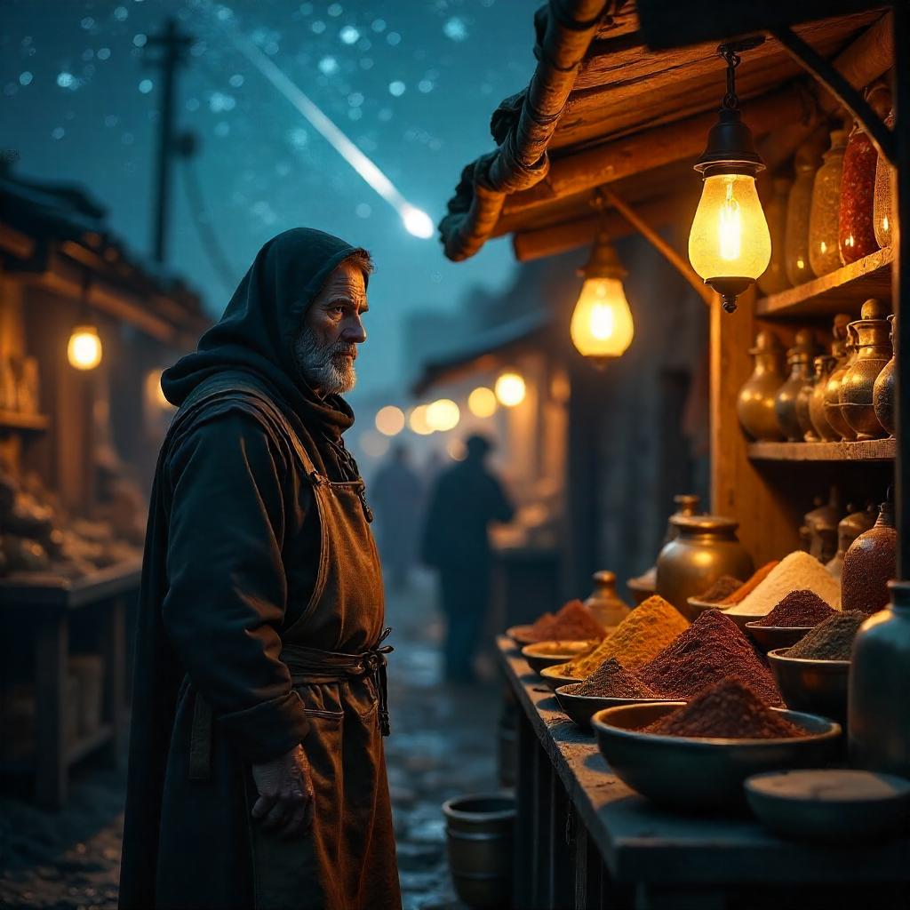 A photorealistic nighttime market scene: a weathered merchant in a leather apron stands beside a wooden stall stacked with spices, fabrics, and brass trinkets. He wears a dark cloak, hood pushed back, a weather-beaten face lit by a warm amber lantern. Realistic textures of wood grain, woven cloth, and tarnished metal are visible. Above him, a meteor shower streaks across a clear night sky, with bright trails reflected in copper bowls and glass jars. Dew glistens on the ground; distant silhouettes hint at other stalls. Shot with a naturalistic, cinematic feel—50mm lens, shallow depth of field, soft bokeh on hanging lamps, and a long exposure to capture meteor trails. Color palette contrasts cool midnight blues with warm gold and orange light. Mood is quiet awe and intimate wonder in a bustling night market.