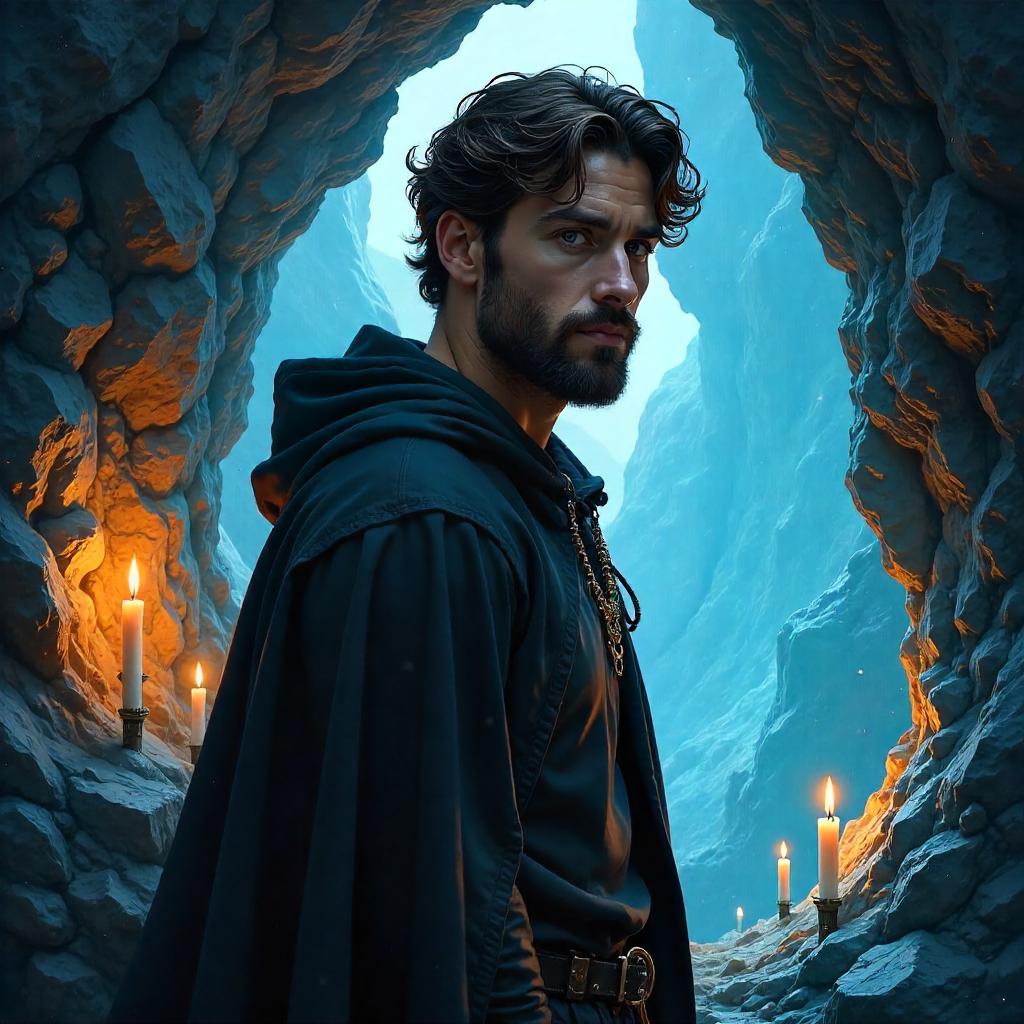 An exquisite oil-painting style portrait of a handsome man standing inside a crystal cavern. Three-quarter view, wearing a dark velvet cloak. The crystal walls glitter with quartz and sapphire prisms, reflecting warm candlelight and cool ambient blue glow. The man has a calm, enigmatic expression, softly curled hair and subtle stubble. Visible painterly brushstrokes and rich impasto on both the crystals and cloak. Dramatic chiaroscuro creates deep depth, with kaleidoscopic reflections on the man's face. Color palette blends cool blues and teals with warm gold highlights for a dreamlike, mystical mood.