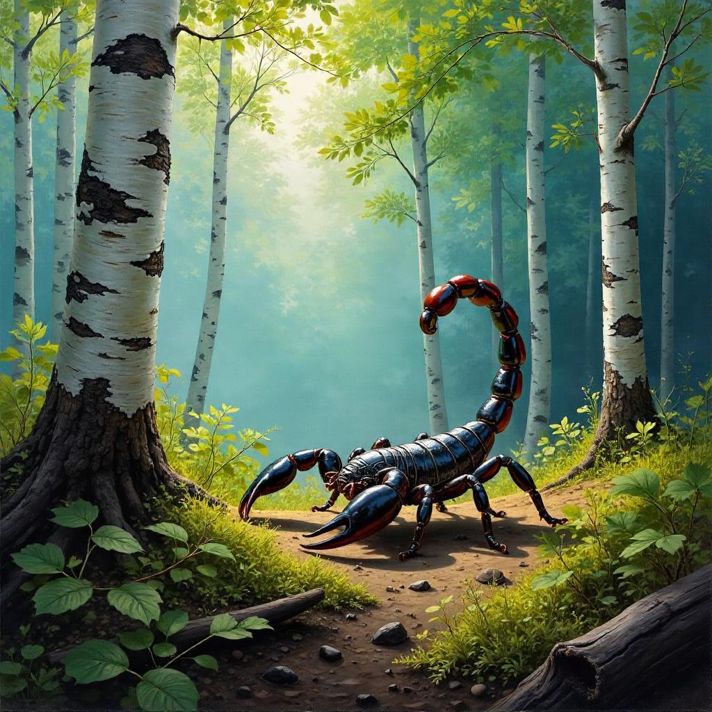 An exquisitely detailed oil painting of a solitary scorpion in a birch forest. Thick impasto brushwork and rich, earthy tones blend emerald greens, ochres, and cool blues. Pale white birch trunks with black markings rise through the mist, dappled sunlight filtering through the canopy and casting long shadows. The scorpion sits on mossy forest floor or a fallen log, its glossy exoskeleton captured with subtle iridescence and meticulous segmentation. The composition emphasizes depth, with a soft, painterly background and crisp focus on the scorpion. Style reminiscent of 19th-century naturalist canvases and contemporary oil textures, high resolution, cinematic lighting, high detail.