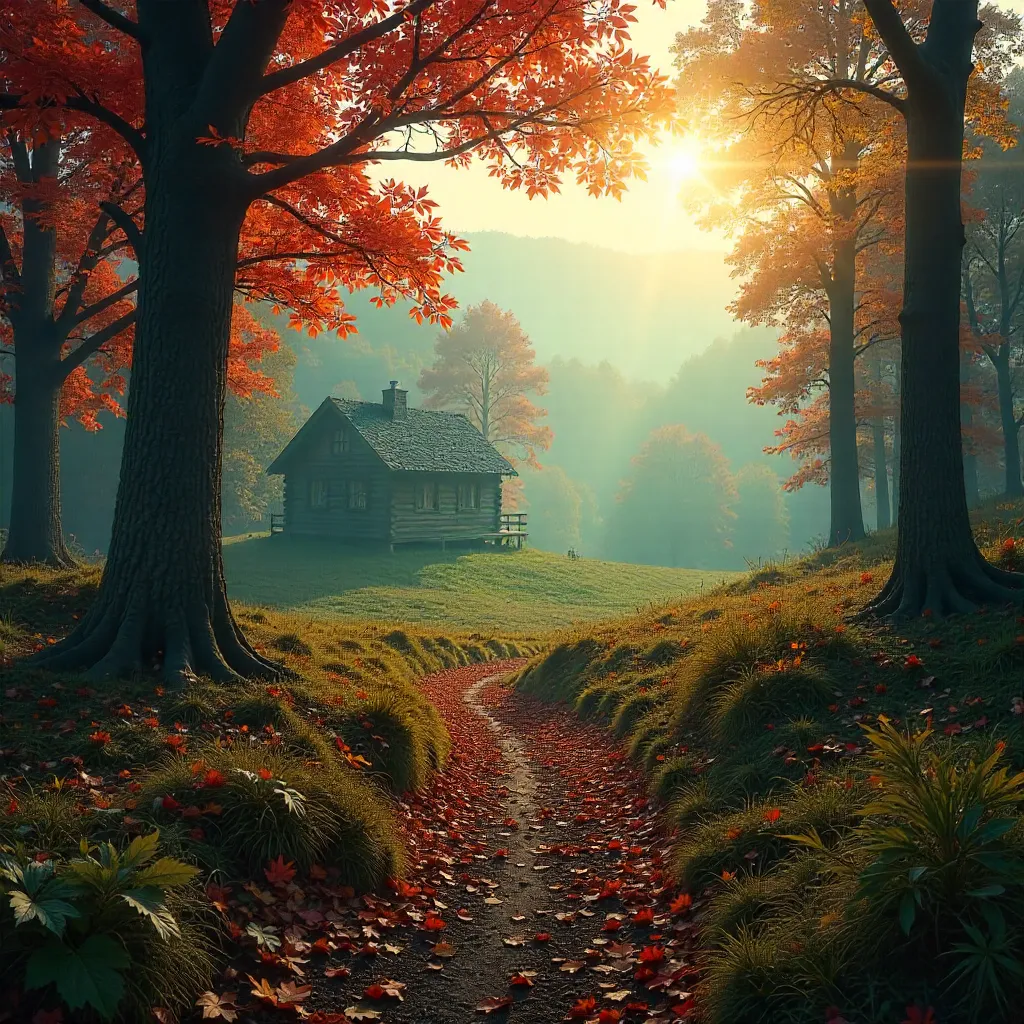 An expansive, serene autumn forest landscape shrouded in gentle fog. The trees display a vibrant palette of red, orange, gold, and emerald leaves, their colors softened by the mist. A narrow leaf-strewn path leads through the foreground toward a small, cozy wooden cabin in the distance, with wisps of smoke curling from the chimney. Diffused golden-hour light filters through the fog, creating ethereal beams and a tranquil atmosphere. The scene is rich in texture: rough tree bark, dew on moss, fallen leaves, and distant hills fading into the haze. Style: hyperrealistic, cinematic photography or painterly digital painting, high-resolution, with soft focus and natural color grading to emphasize serenity and quiet solitude.