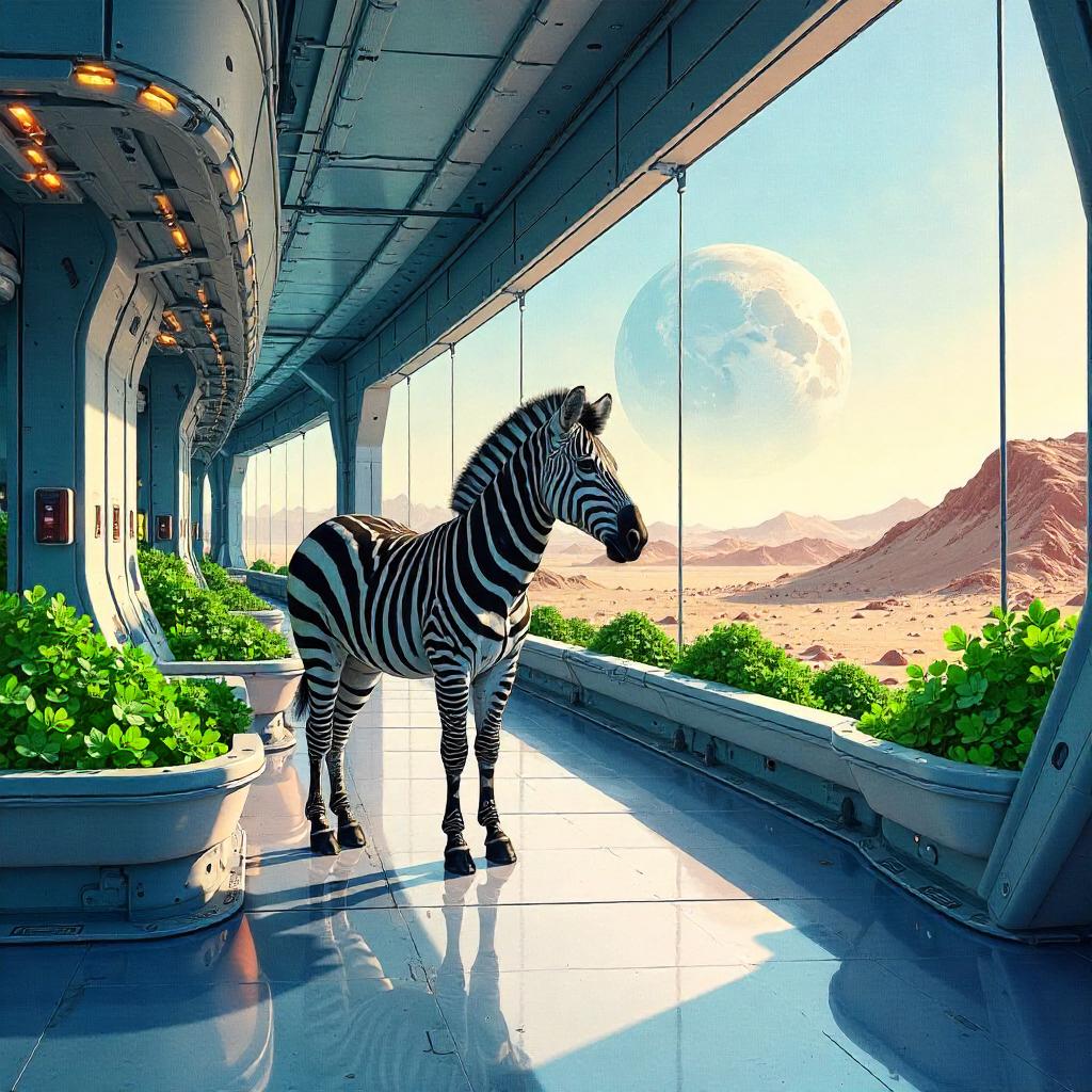 A watercolor illustration of a zebra inside a terraforming station. The zebra stands near a glass wall with a view of a distant, barren planet. Inside, hydroponic bays with lush green foliage line the corridor, robotic arms drift beside glowing control consoles, and soft lights illuminate chrome panels. Render in delicate watercolor washes with wet-on-wet technique, subtle color bleeds, and a textured paper grain. Use cool blues and greens for the interior and warm oranges and reds for the planetary horizon visible through the window. The mood is calm, dreamlike, and a fusion of nature with advanced technology.