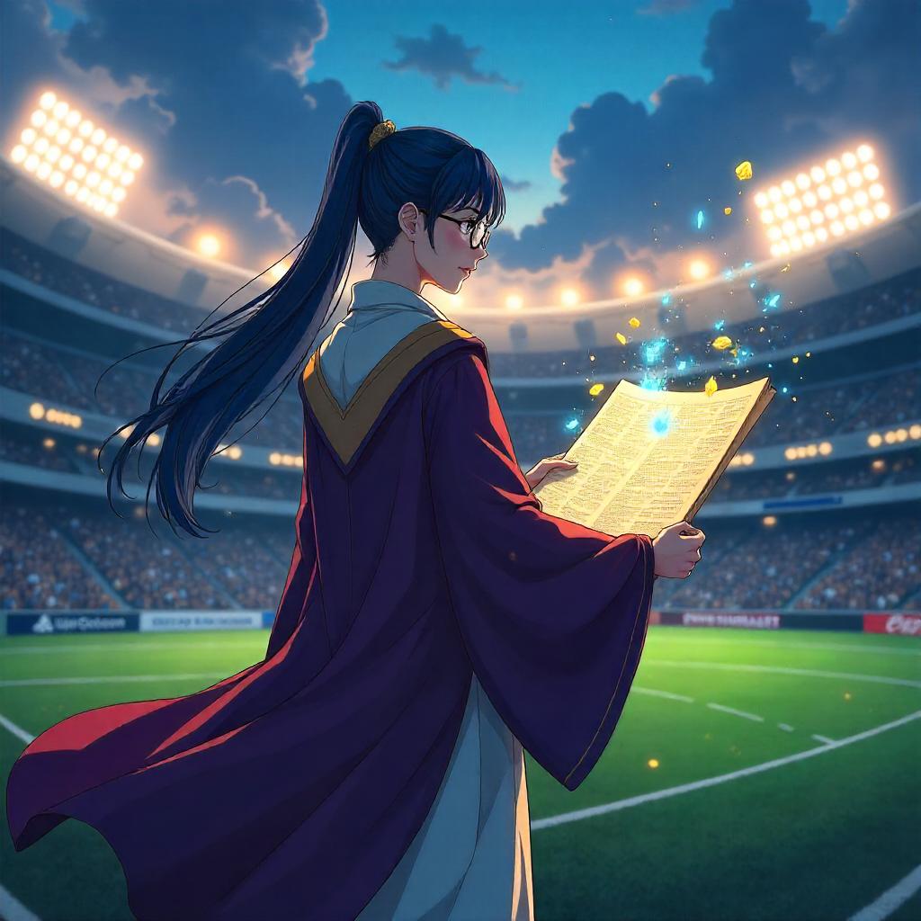 An anime-style scholar stands in the center of a colossal sports stadium at dusk. The character wears a flowing traditional academic robe with subtle futuristic athletic accents, round glasses, and long dark-blue hair tied back. They hold an open ancient scroll that glows with blue-gold runes, casting magical light and swirling particles around them. The stadium seats recede into the distance with a blurred crowd, while the field is illuminated by towering floodlights, creating dramatic shadows and lens flares. The art style is vibrant, highly detailed cel-shaded anime with crisp linework, cinematic lighting, and a dynamic, empowering pose. Low-angle composition to emphasize scale and intellect, mood of intelligent inspiration and magical realism.