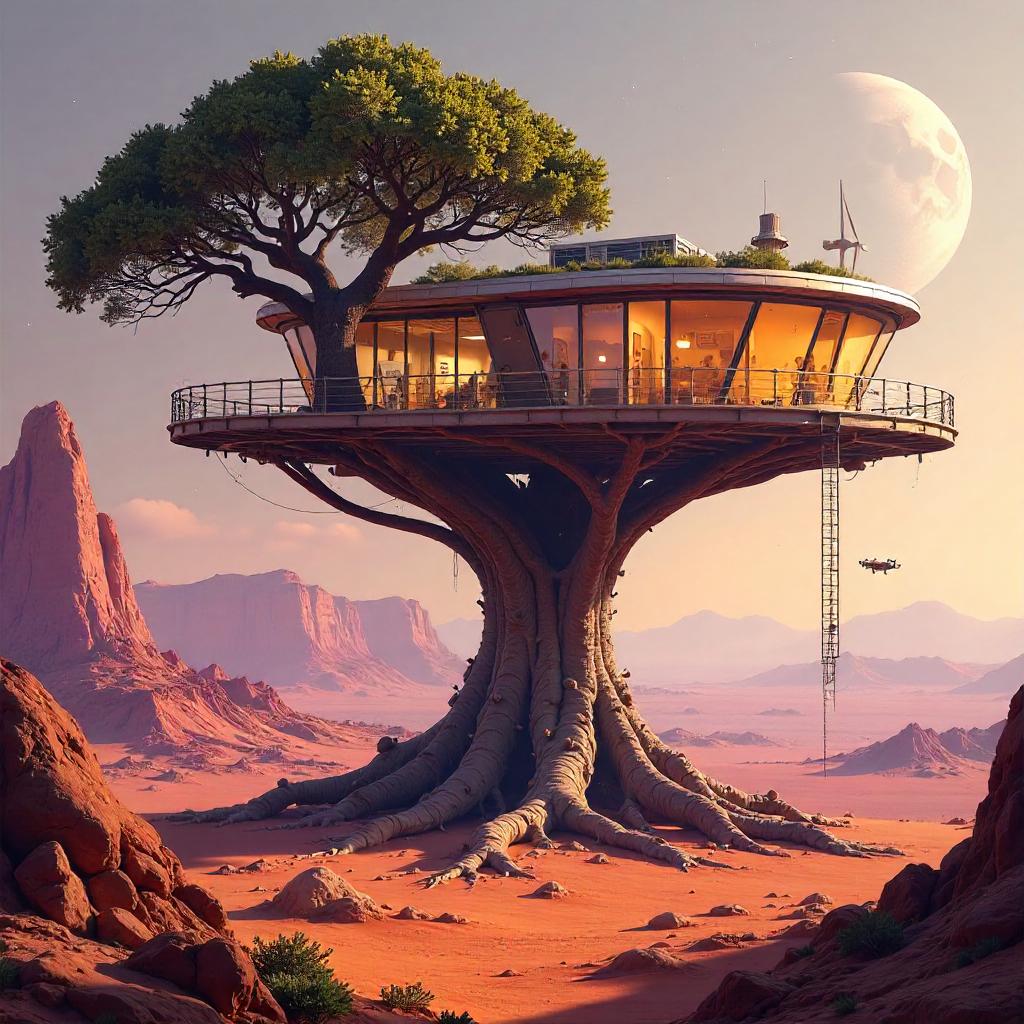 An expansive concept art scene of a treehouse perched on a colossal alien tree on the dusty red plains of Mars. The structure blends timber-like planks with pale titanium supports and glass walls, featuring multiple levels, wraparound balcony, solar panels, and wind turbines. The tree’s branches coil around metal scaffolding, with a living canopy of bioluminescent panels. The Martian landscape shows orange-red rocks, fine dust, distant canyons, and Phobos and Deimos visible in a lavender dusk sky. Warm interior light spills from windows, casting long shadows on the ground. A rope ladder ascends to a upper deck while a small drone hovers nearby. Thin atmosphere, stars glimmer, dust swirls. Cinematic concept art style, high detail, painterly textures, dramatic lighting, wide-angle perspective, emphasizing scale and sci-fi adventure.